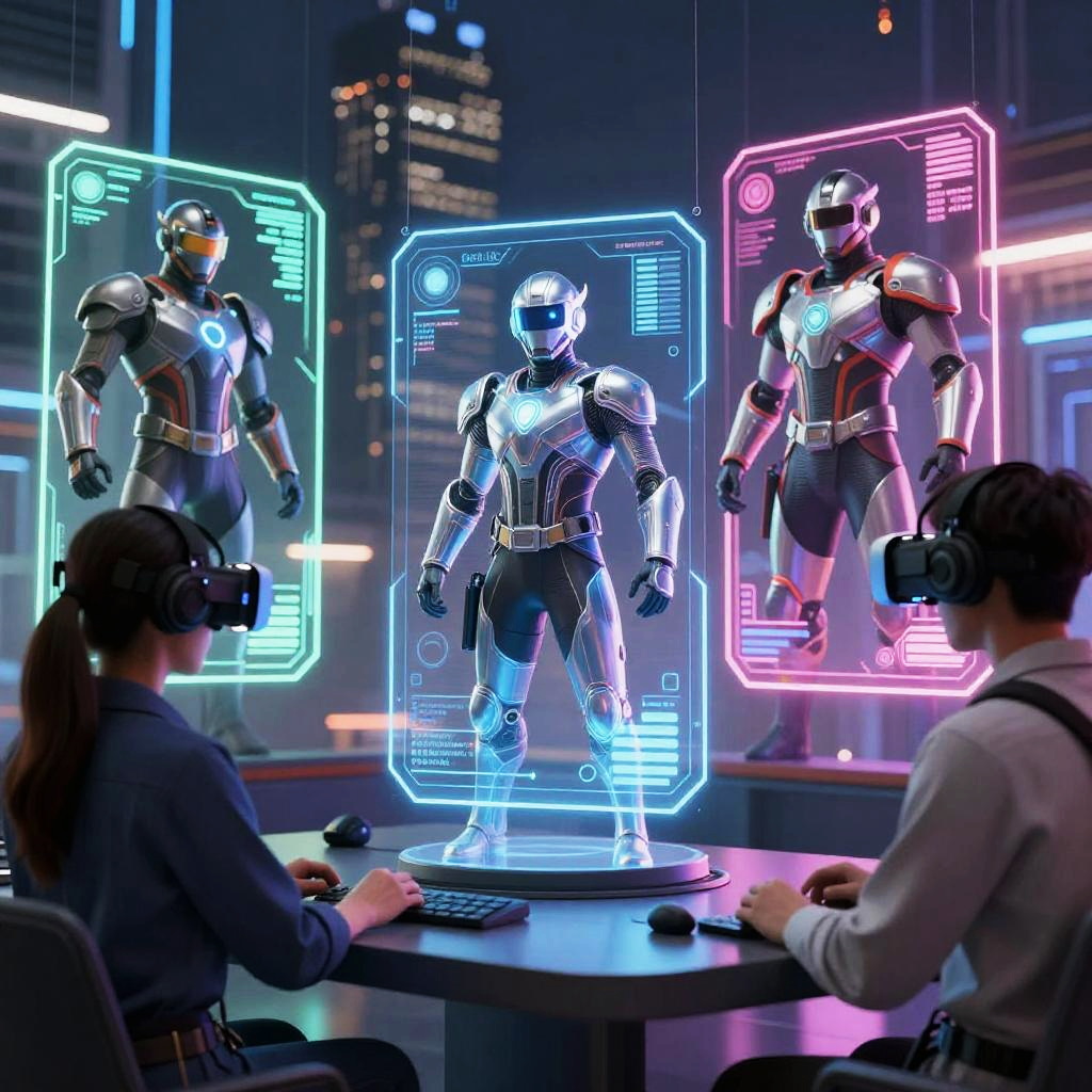 Photograph of a futuristic, neon-lit room featuring three holographic, metallic humanoid robots displayed in glowing blue, green, and pink frames. Two people, wearing VR headsets, sit at a table with keyboards in the foreground, observing the holograms. The background shows a cityscape with illuminated skyscrapers. The robots have sleek, robotic designs with glowing blue accents, and the scene has a high-tech, cyberpunk aesthetic. The image is vivid with bright, contrasting colors and a modern, sci-fi theme.