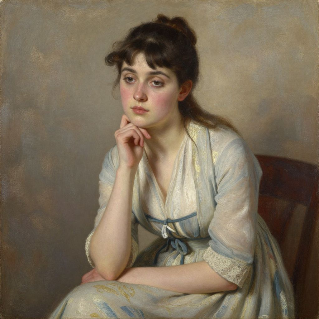 This is a digital painting in a realistic style of a young woman with pale skin and dark brown hair, styled in a loose bun with bangs. She is seated on a wooden chair against a neutral, textured background. She wears a light-colored, striped dress with a high neckline and buttoned placket. Her left hand is raised to her chin, and she gazes pensively to the side. The dress has a slight sheen, and the lighting highlights her soft features and delicate expression. The overall mood is contemplative and serene.