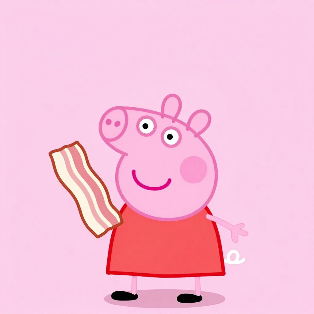 Did Peppa Pig eat bacon? Surreal cartoon scene with Peppa Pig looking surprised at a breakfast table with crispy bacon, bright colors, whimsical style, playful lighting