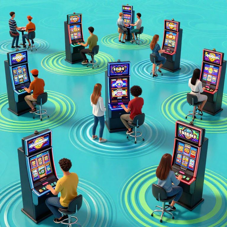 "Hierarchy futuristic fun image topography with ripples, bright colors, at least fifteen diverse people young and old playing slot machines,"