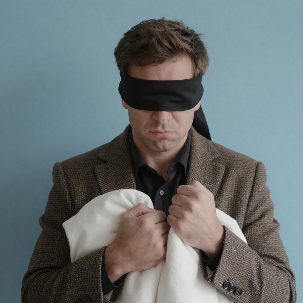 Photograph of a man with a blindfold, brown hair, brown houndstooth jacket, clutching a white blanket, fist clenched, intense expression, against a light blue wall.