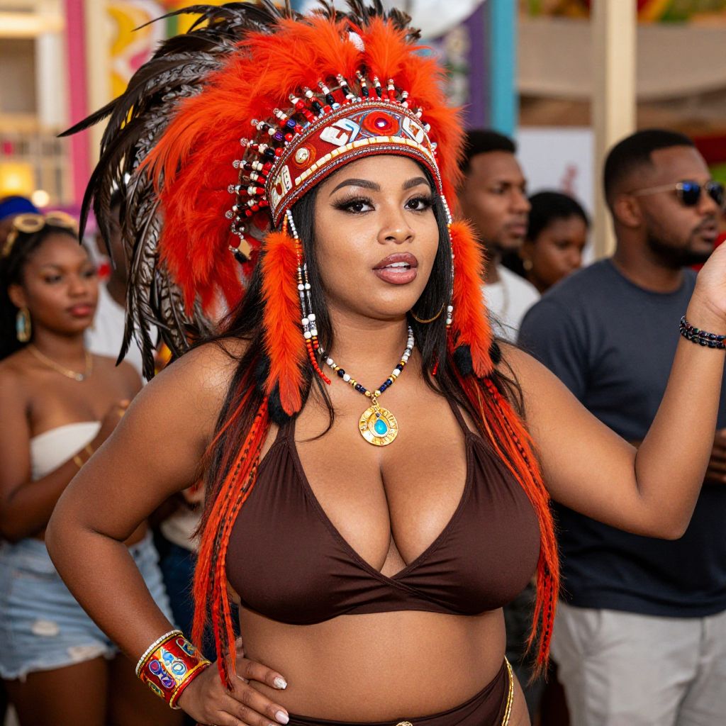 A woman with a voluptuous figure, big tits, and a sexy demeanor is wearing a brown outfit with a red and orange headdress. The headdress features a large headpiece adorned with feathers and beads, adding to her striking appearance. She is also adorned with a necklace that has a pendant and a bracelet. The scene includes people in the background, enhancing the atmosphere of the setting. The woman exudes confidence and allure, with her expressive eyes and poised posture capturing the attention of onlookers. The setting is vibrant and lively, with the atmosphere filled with energy and cultural significance.