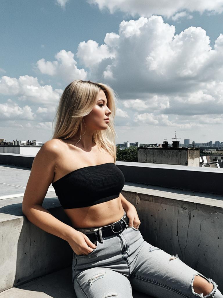 1girl, woman, large brasts, underboob, wearing ultra-short bandeau crop top and high-waisted relaxed-fit ripped jeans in bright white top with light washed denim on medium-toned woman with dark sun-lightened hair posed leaning one shoulder against the wall, legs stretched out and hands in her lap in minimal outdoor corner with smooth light grey wall under slightly hazy daylight for softer edges, laid-back summer lifestyle fashion photography, high resolution, ultra-detailed