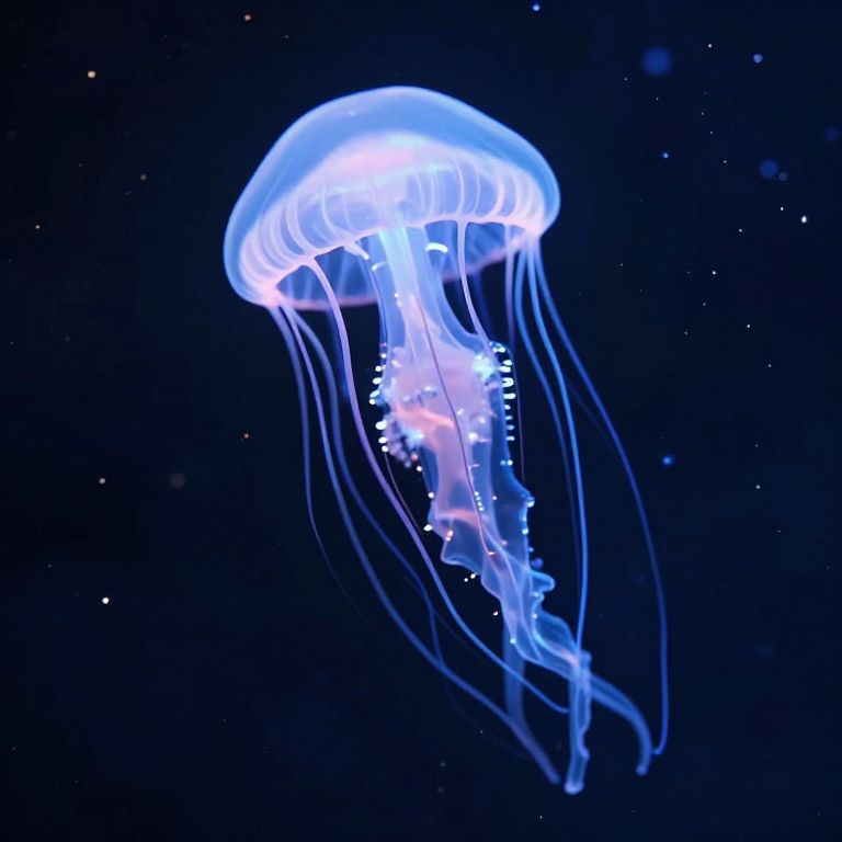 In the depths of an ethereal cosmos, a bioluminescent jellyfish drifts serenely, its radiant trails weaving stories of cosmic wonder and existential beauty, while whispers of stardust sing of infinite possibility.