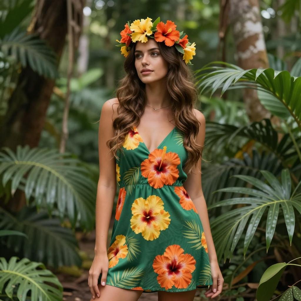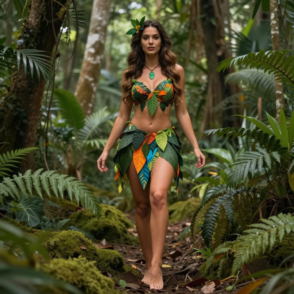 Woman in Leaf and Flower Costume with Straw Hat