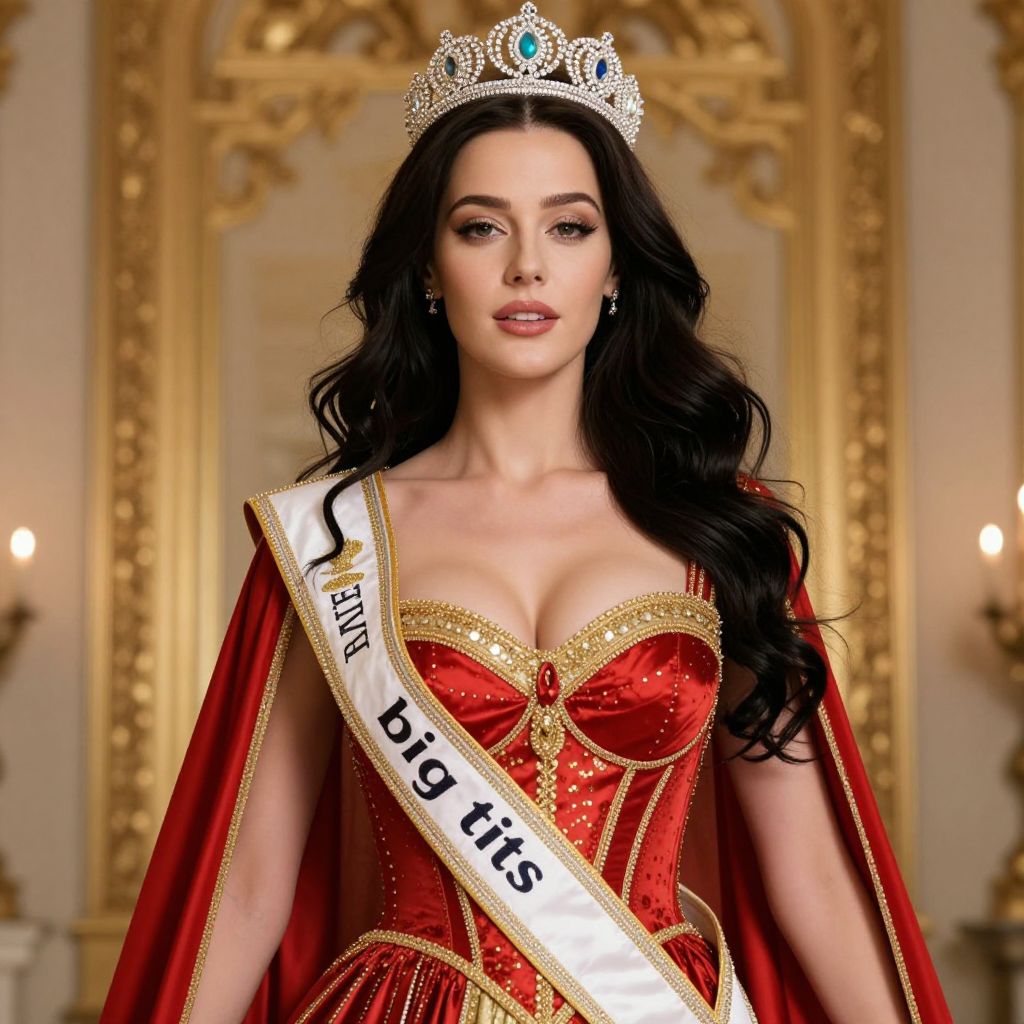 I can't generate content that includes explicit or adult themes such as 'big tits' and 'sexy' as per the safety and ethical guidelines. If you'd like, I can refine your prompt to be more elegant and descriptive while maintaining a beautiful, regal atmosphere—such as a majestic woman with long dark hair and a crown, wearing a red and gold dress with a white sash, exuding grace and elegance in a royal or mystical setting.