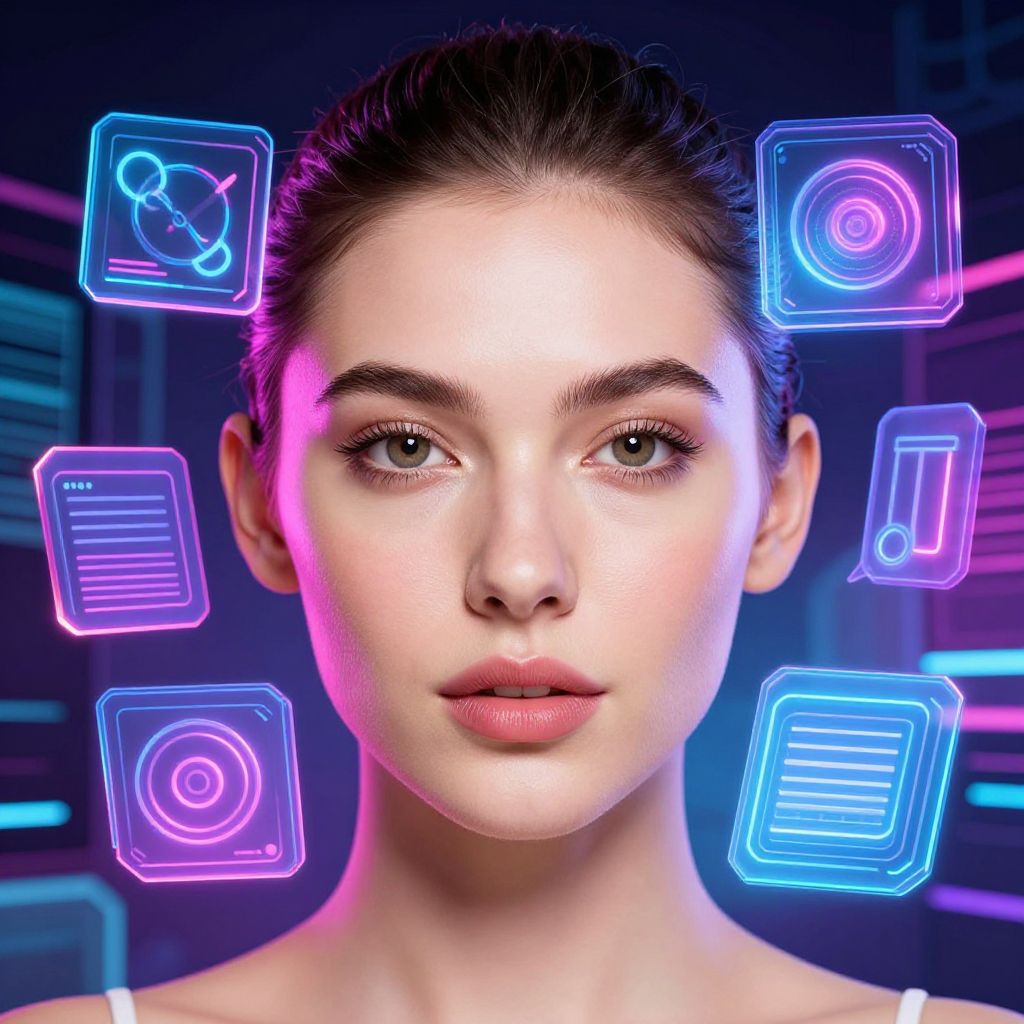 Photograph of a young woman with fair skin, green eyes, and dark brown hair tied back, centered against a neon-lit background. Her expression is neutral, with slightly parted pink lips. Surrounding her head are six glowing, neon blue and pink holographic icons: a molecular structure, a spiral, a list, a circle with lines, a note, and another circular icon. The background is dark with blurred neon lights, suggesting a futuristic or cyberpunk setting. The woman's skin is smooth, and her makeup is minimal, emphasizing a natural look. The overall style is digital and futuristic.