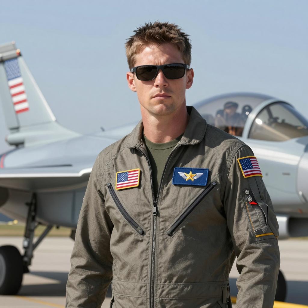 Top gun maverick man costume, photograph of handsome man, standing in spacious hangar, wearing dark blue leather jacket, light blue shirt, grey jeans, brown leather boots, dark sunglasses, short brown hair, modern style, airplane in background, arched window, sunlight streaming in, casual yet stylish, confident pose, indoor lighting, detailed ures, warm color palette, contemporary fashion, aviation theme
