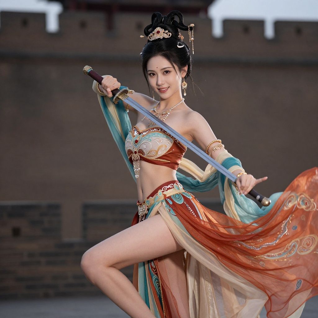 CR1.3, (flirtatious, seductive:1.4), (RAW photo:1.2), (photorealistic:1.6), (lens 135mm, f1.8:1.2), (ultimate quality, masterpiece:1.3), (intricate details:1.2), (detailed face:1.2), dramatic, ray tracing, fashion photograph, good hands, Fixhand, fFaceDetail, Full body, Sharp focus, cinematic lighting, (floating clothes, thighs, dunhuang cloths, hanfu, waist cape, strapless, navel, robe:1.2), swordswoman, (holding sword, fighting stance:1.6), (1girl, solo, outdoors, war castle:1.6), confident smile, beautful face, (large breasts, narrow waist:1.2), sexy body, perfect body, shiny hairs, zanhua, hair ornament, earrings, necklace, jewelry, (anatomically correct hands, anatomically correct feet, anatomically correct body:1.6)