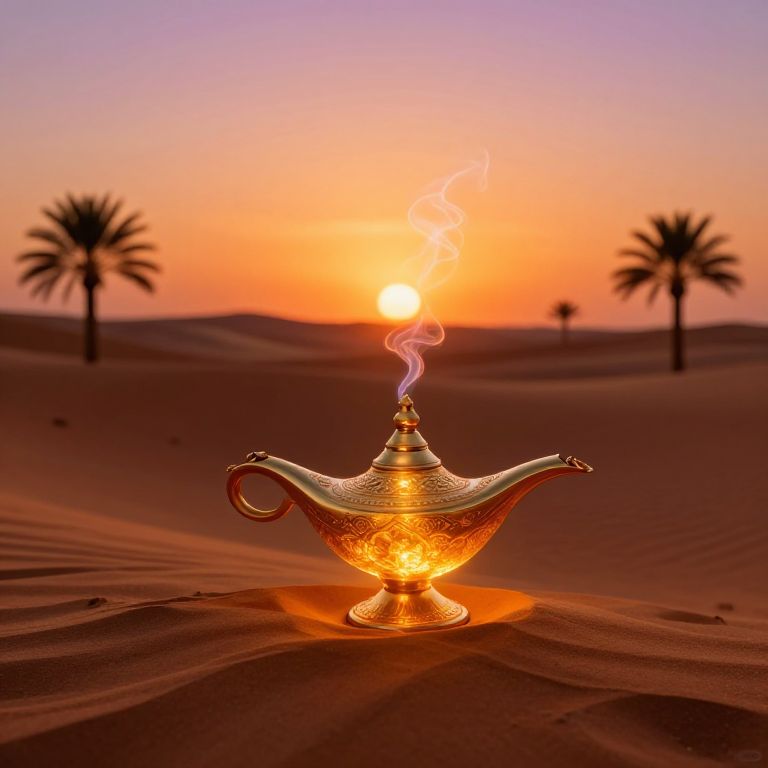 Photograph of an ornate, glowing genie lamp with smoke rising, set in a desert at sunset, with silhouetted palm trees in the