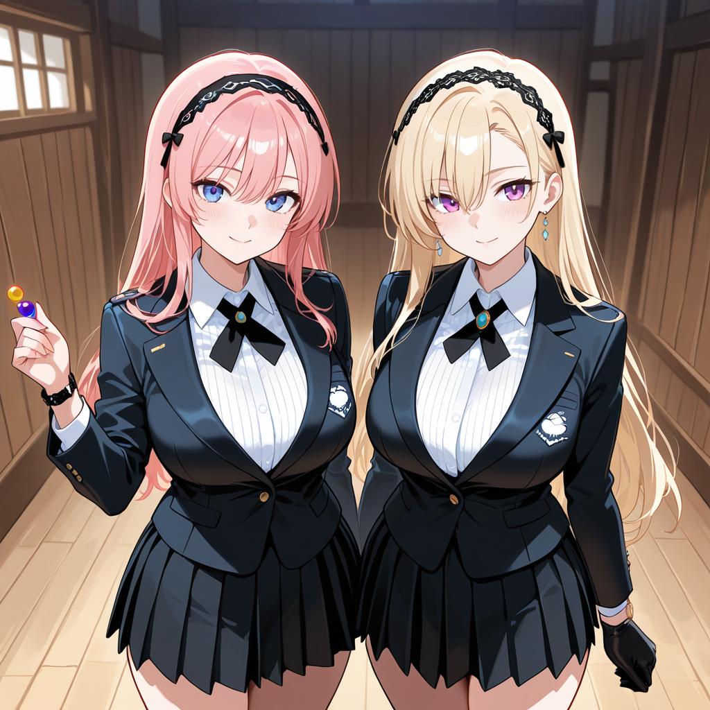 Digital artwork featuring two anime-style young women sitting on a bed in a rustic wooden room. Both girls have distinctive voluminous hairstyles—one with long dark purple hair and the other with blonde hair—wearing matching white dresses with black belts, black bows with blue jewels at the collar, and black gloves. Each wears a jeweled headband complementing their outfits. The setting conveys a warm, softly lit atmosphere with attention to pleated fabric details and delicate accessories.