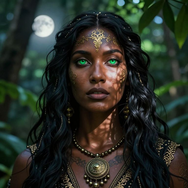 Photograph of a dark-skinned woman with striking green eyes, set against a blurred forest background. She has long, wavy black hair adorned with golden ornate headpieces and jewelry, including a large circular necklace with intricate designs. Her face is decorated with gold patterns on her forehead and cheeks. Her expression is serious, and the sunlight filtering through the trees casts shadows on her face. The image has a high-contrast, magical realism style, highlighting her vivid eyes and the detailed gold jewelry against the lush greenery. The background is out of focus, emphasizing the subject's face and adornments.
