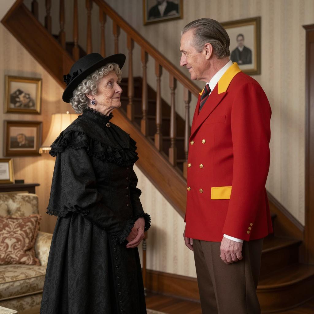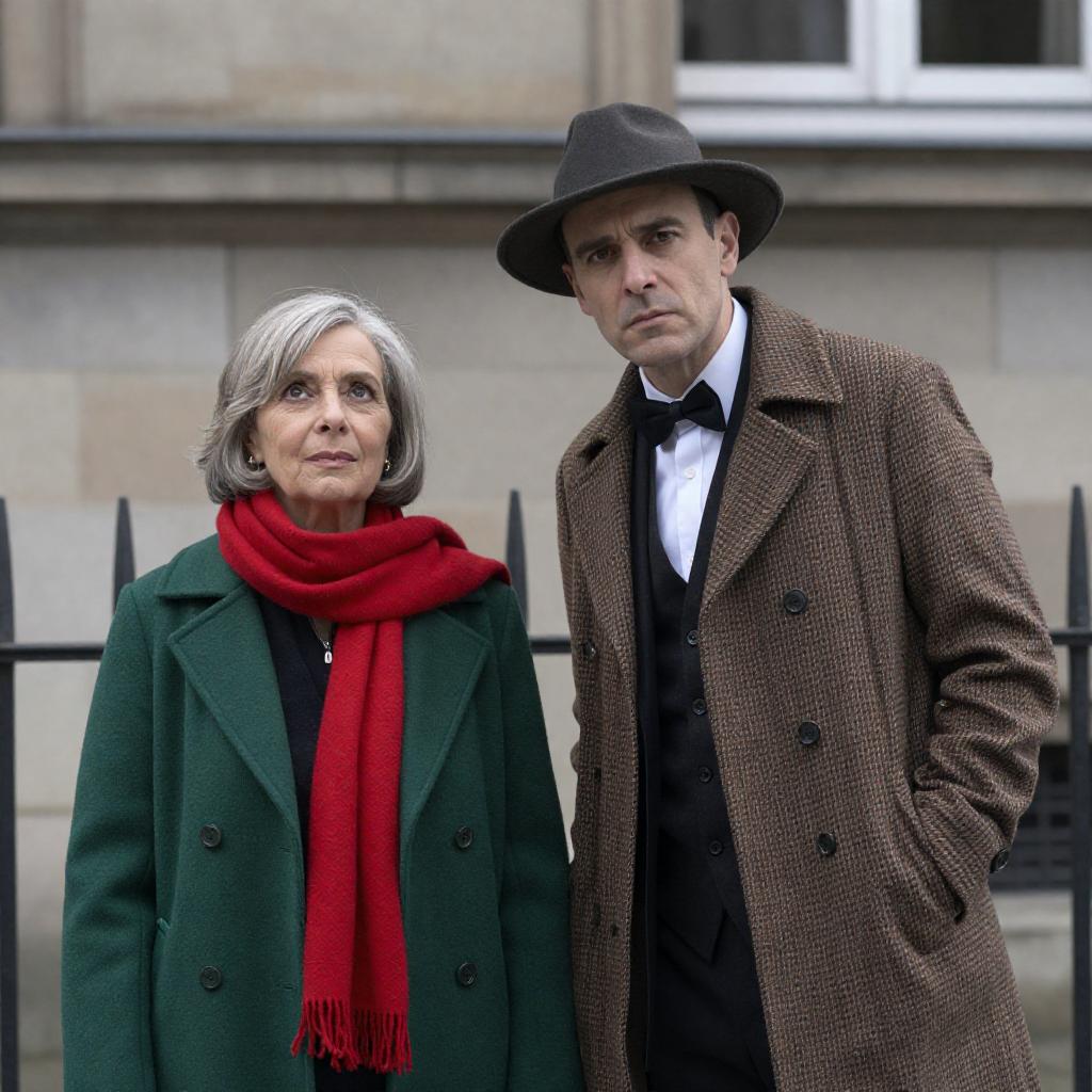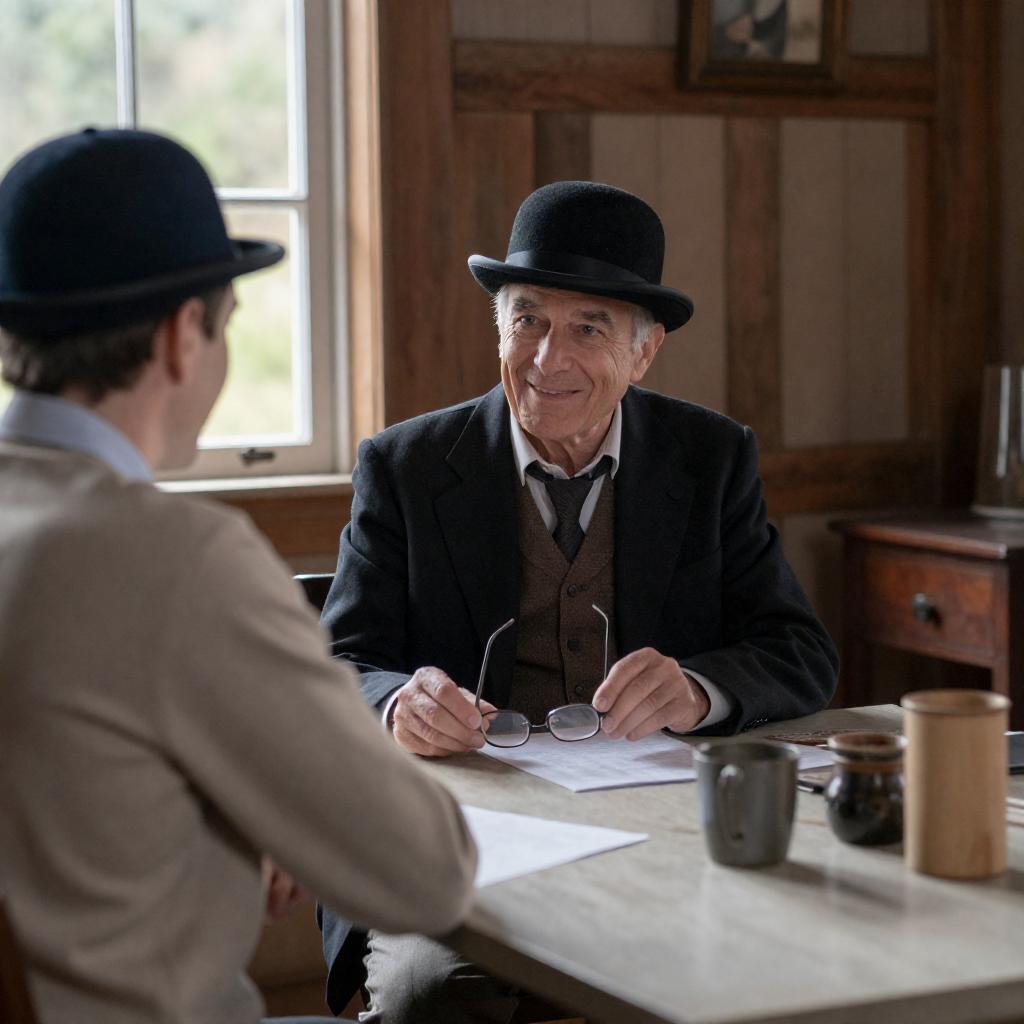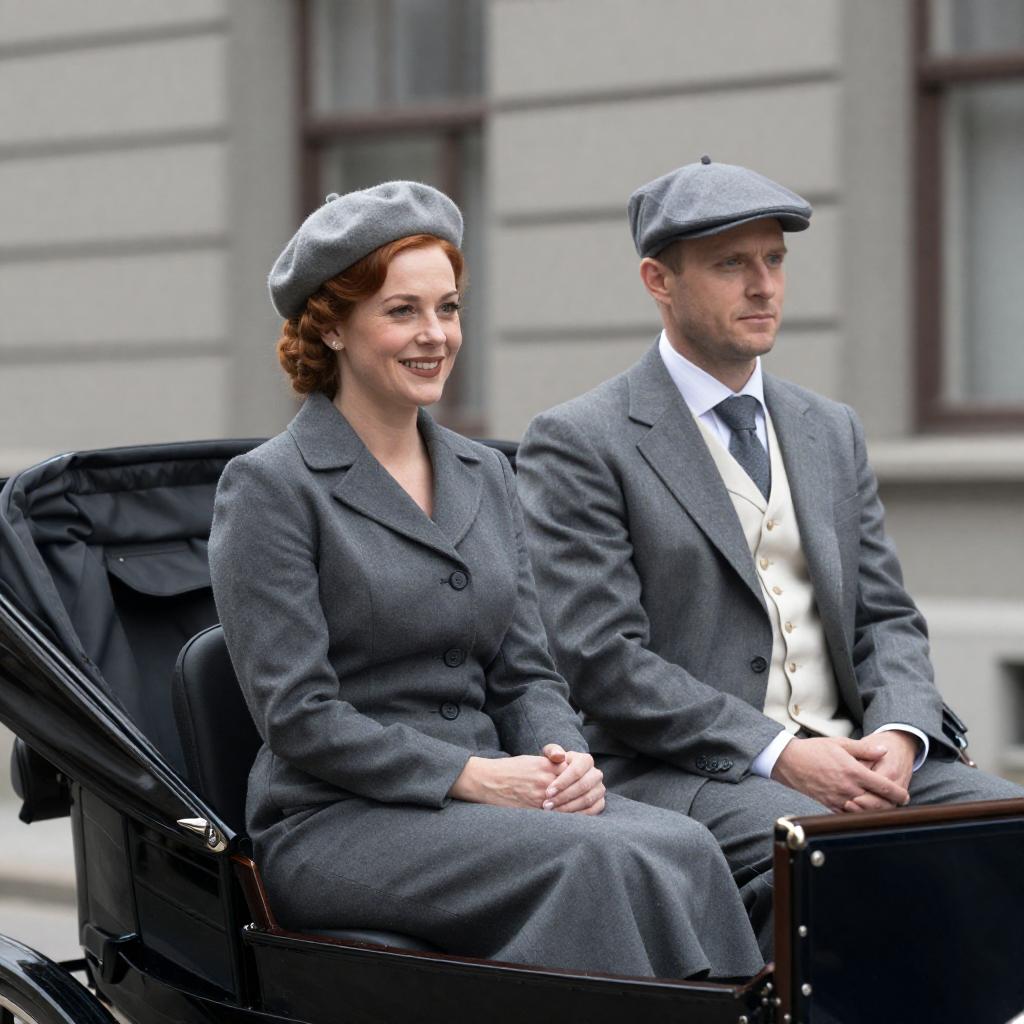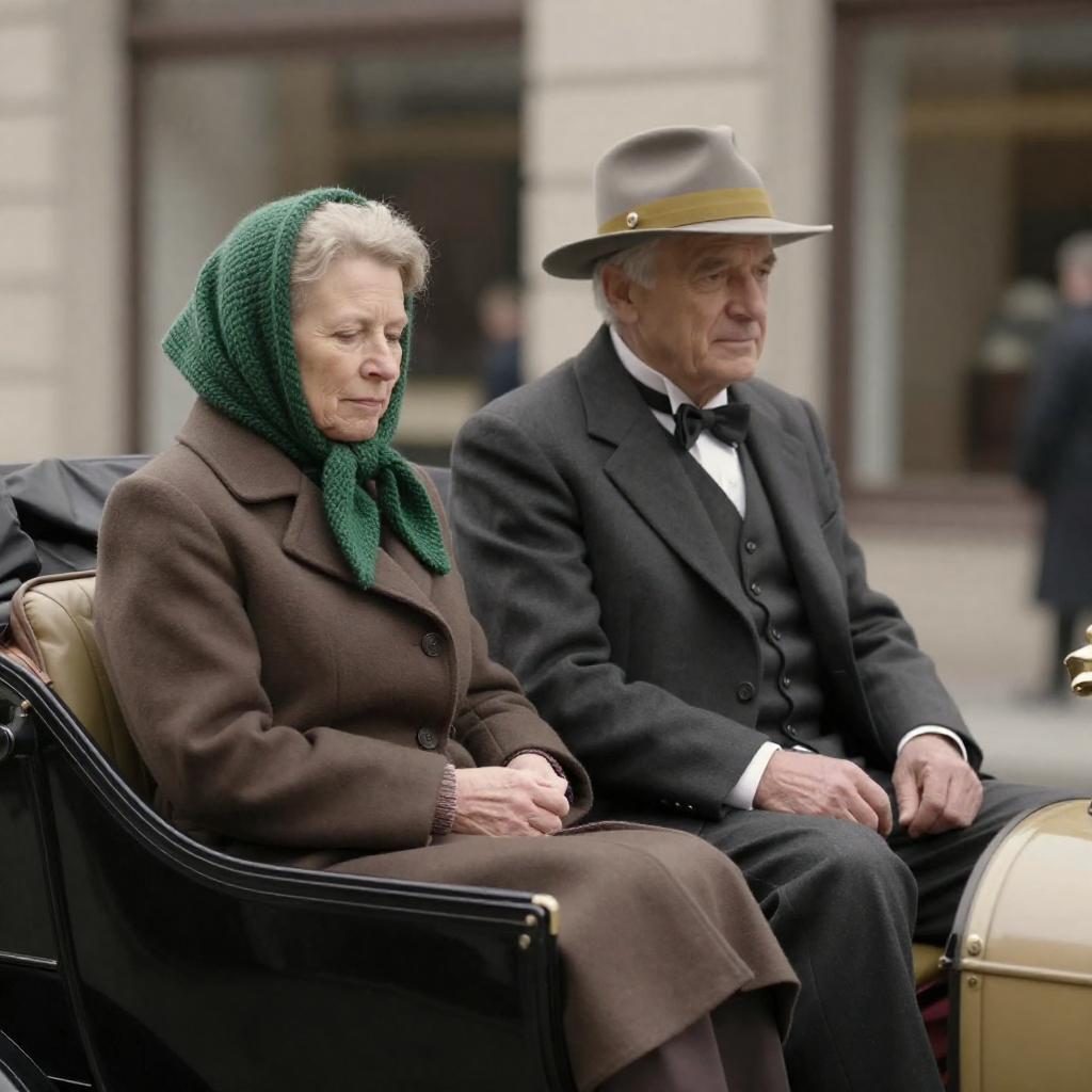An elderly man and woman sitting side by side in an early 20th-century vintage car. The man is dressed in a dark three-piece suit with a black bow tie and a light gray fedora hat with a gold band. The woman wears a brown coat and a green knitted headscarf. Both have calm and reflective expressions. The car features a black exterior frame with beige interior seats. The background is an urban setting with a blurred storefront.