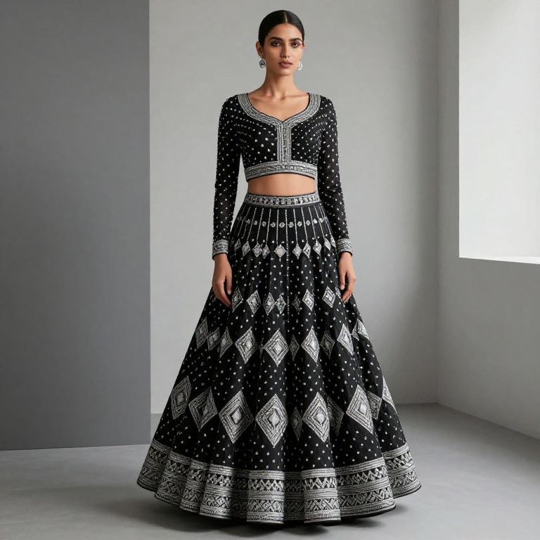 Midjourney lehenga photo prompts: A contemporary black lehenga with geometric print and silver thread detailing, posed in a modern urban studio with minimalist background, clean lines, professional fashion photography style.