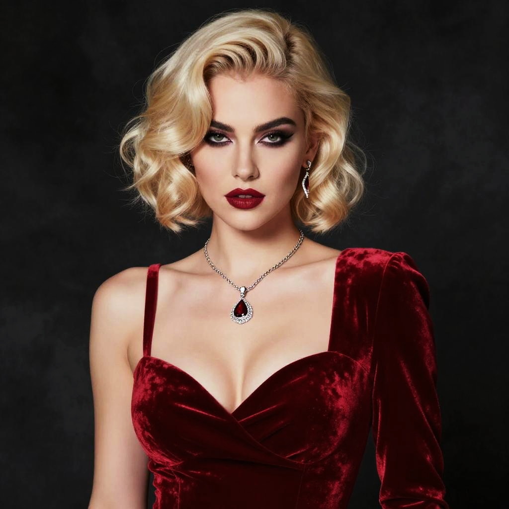 Photograph-style digital art of a glamorous woman with short, wavy platinum blonde hair. She's wearing a deep red velvet dress with a plunging neckline, highlighting her cleavage. Her eyes are dark and intense, with smoky makeup. She has a silver necklace with a pendant and matching earrings. The background is dark and textured, making her stand out. The overall vibe is vintage and sultry.
