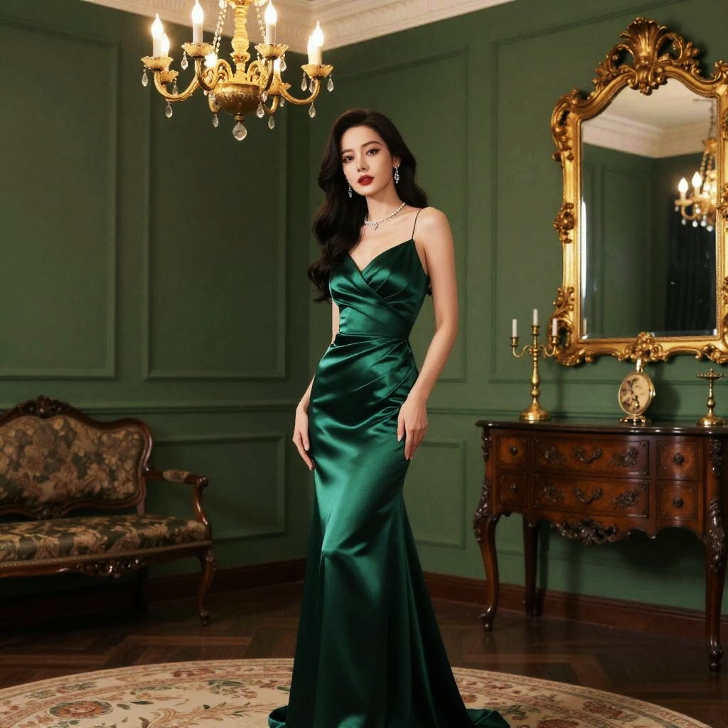 A sophisticated woman in an elegant emerald green satin gown poses gracefully in a vintage-style room with dark green paneled walls. The luxurious setting includes an ornate chandelier, classic wooden furniture, and a large gilded mirror that enhance the refined atmosphere.