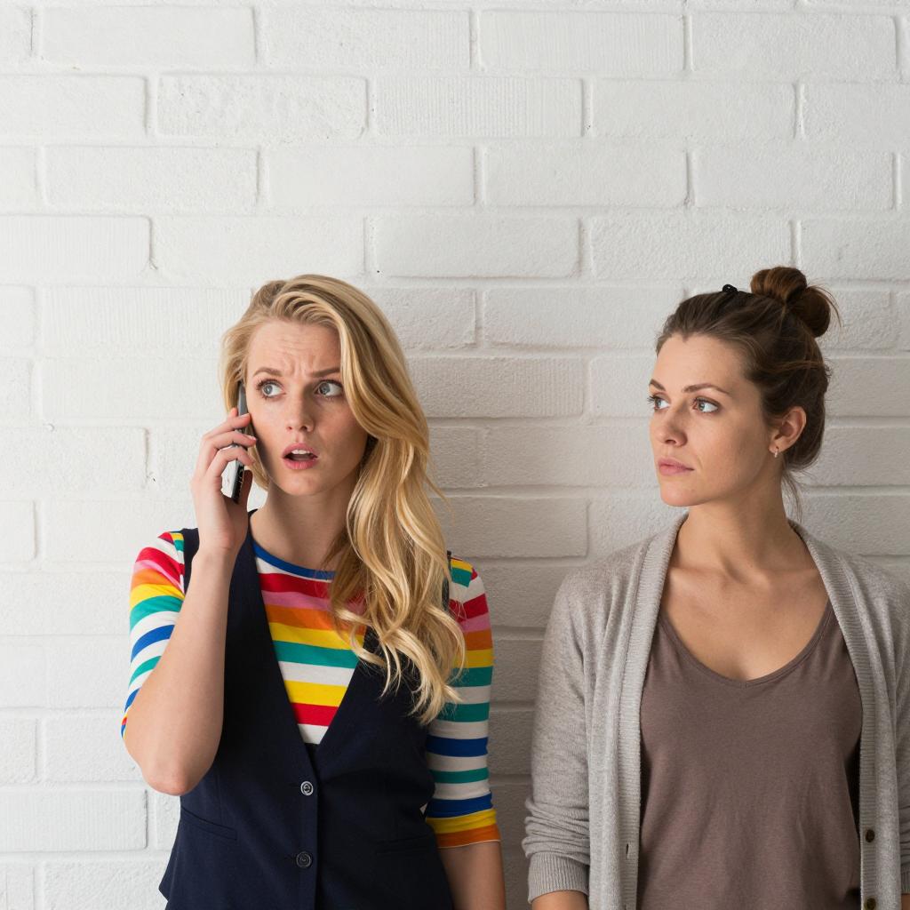 A photograph of a young girl with brown hair in a pink shirt facing a woman with blonde hair in a blue shirt. The woman leans forward intensely. Background includes a cluttered bedroom with pink walls, shelves, toys, and a window with light. A dog sits on the bed in the background. Two people, indoor setting.