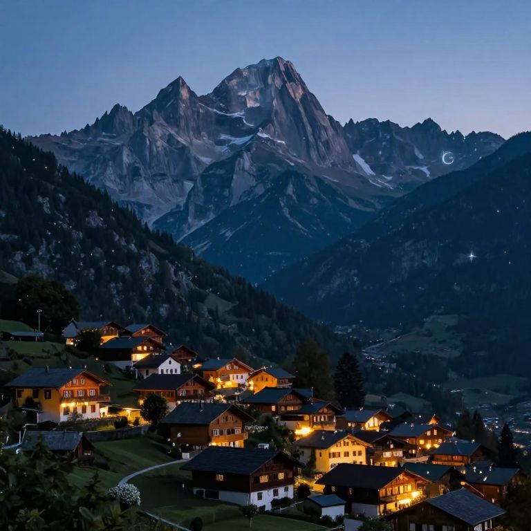 Photograph of a picturesque alpine village at dusk with warm-lit houses, surrounded by dark, rugged mountains and a clear blue sky.