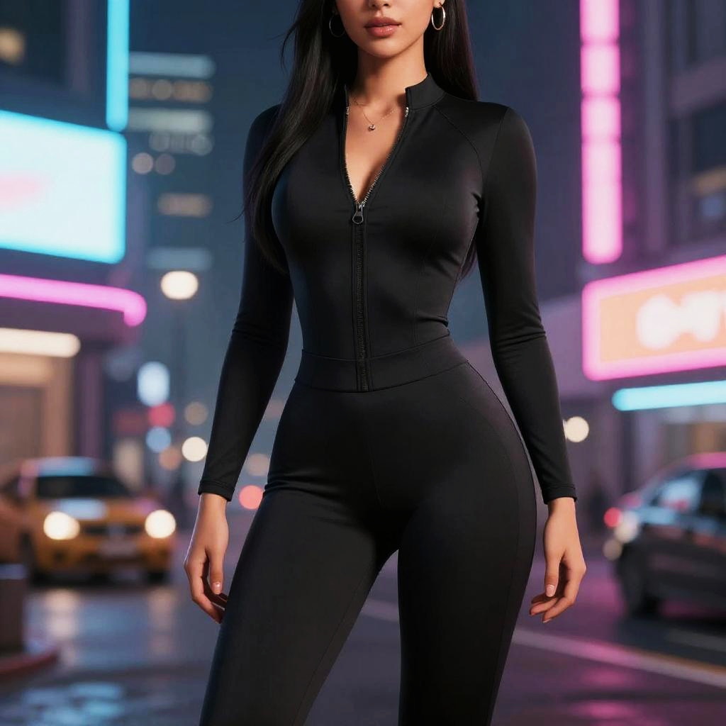 Realistic photo.3D rendering of a hot girl with pitch black, wearing a stunning bodycon jumpsuit under neon city lights. realistic photo