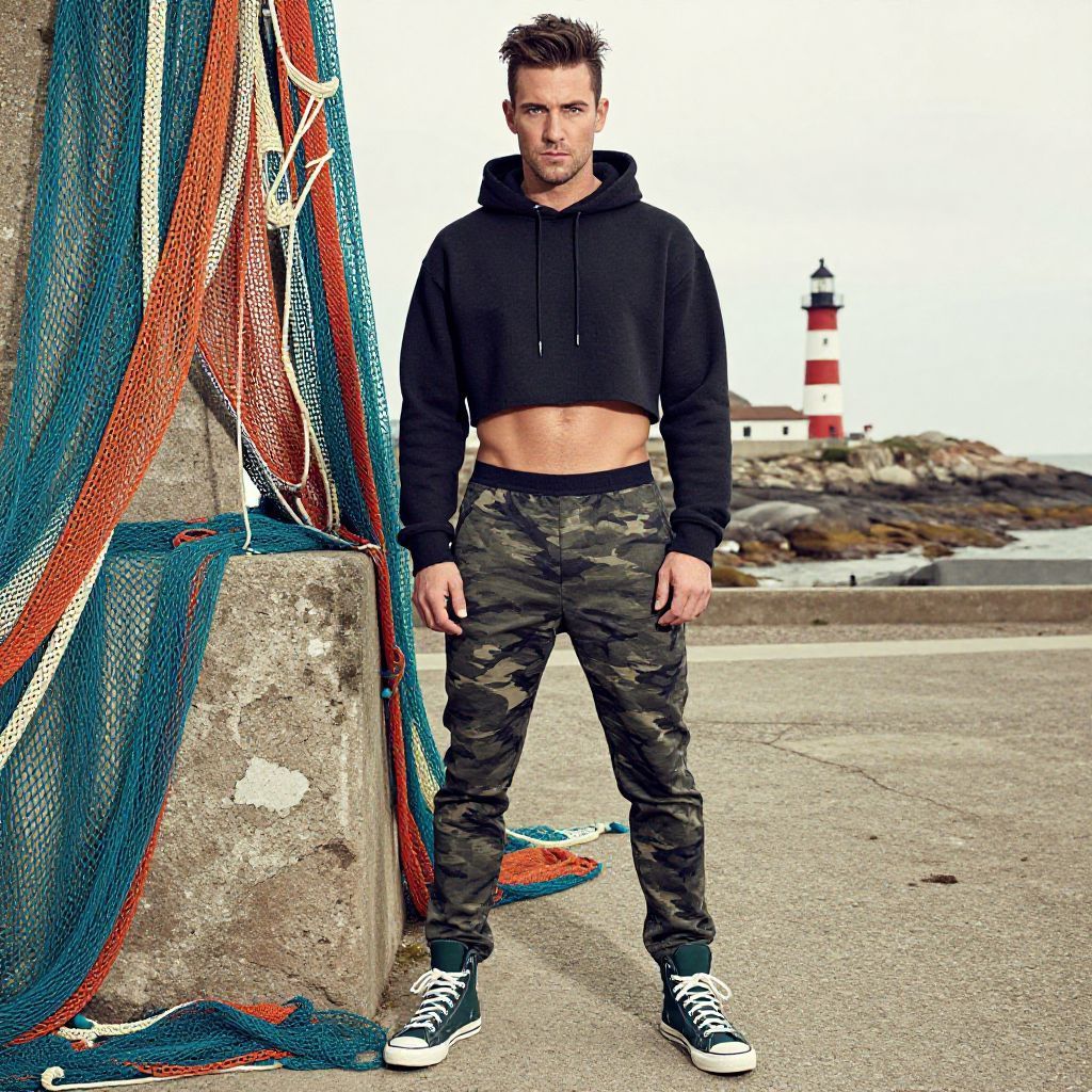 A man, charcoal cropped hoodie, camo print leggings, dark green high-top sneakers, streetwear style, cracked concrete, vibrant fishing nets, distant lighthouse beacon, lithographic film style, confident expression Man has masculine face and piercing eyes