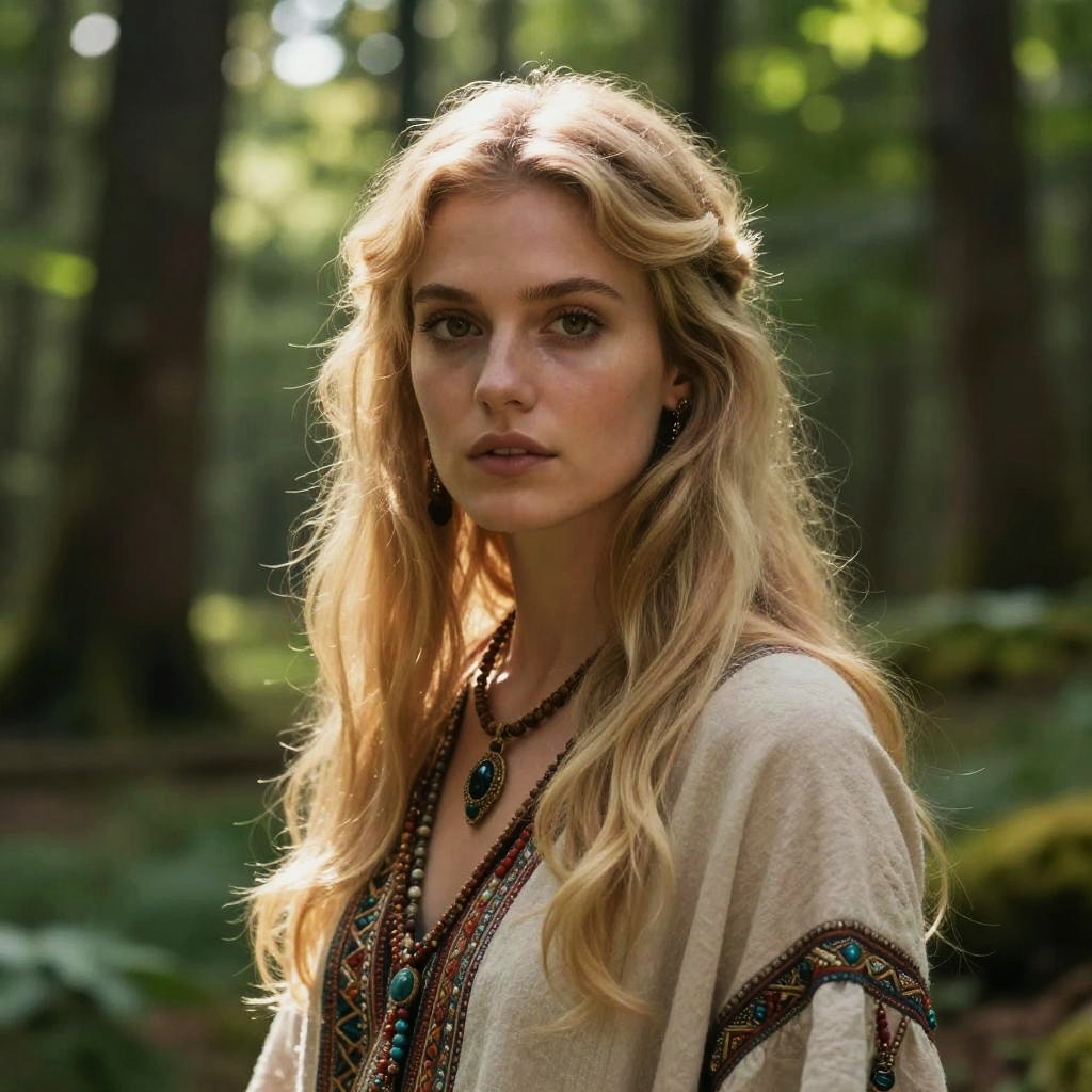 Portrait of an ancient Maia spirit, in a Lord of the Rings setup. Shot on Portra 400 film, the image highlights a full torso and abdomen, emphasizing a clear complexion, natural beauty, and mystic style.