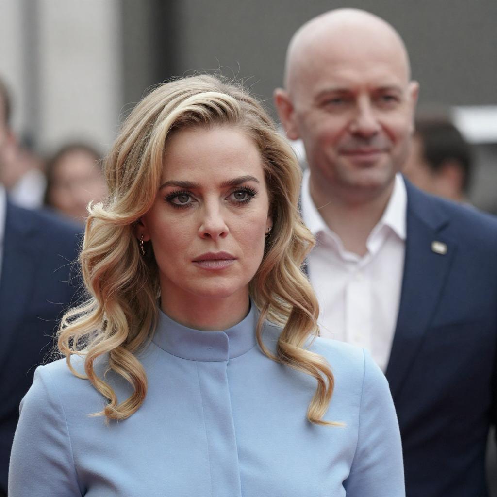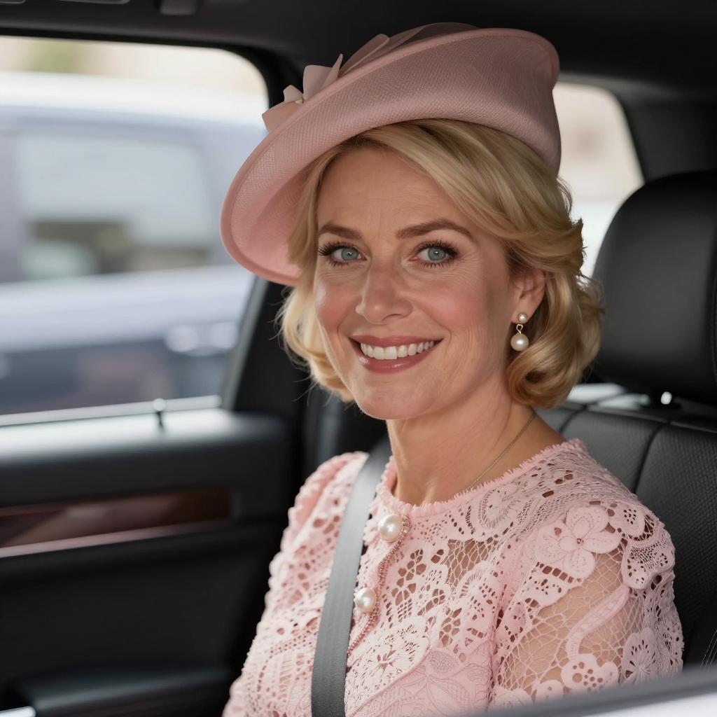 Photograph of a blonde woman in a pink outfit with matching hat and pearl necklace, smiling, holding a small tan and white dog. She is surrounded by several men in black suits, some looking away. Sunlight illuminates the scene.