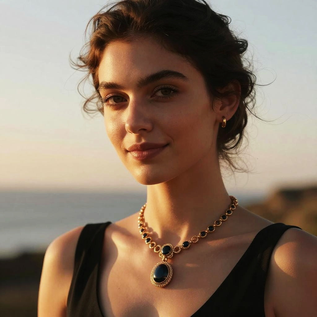 (highly detailed skin), sunrise, (golden hour), outside, gorgeous, (realistic face), fashion, close-up, necklace, (black dress:1.1), slight smile, artistic