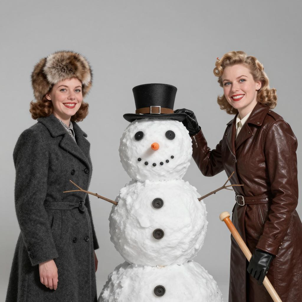 Black and white photograph of two women and a snowman. Woman on left wears fur hat, dark coat, smiling. Woman on right in leather jacket, gloves, holding snow shovel, smiling. Snowman in center with carrot nose, coal eyes, buttons for eyes, and mouth. Woman on right holds snowman's hat. Background is plain gray. Both women have fair skin and 1950s-style hair. Snowman stands between them, slightly off-center.
