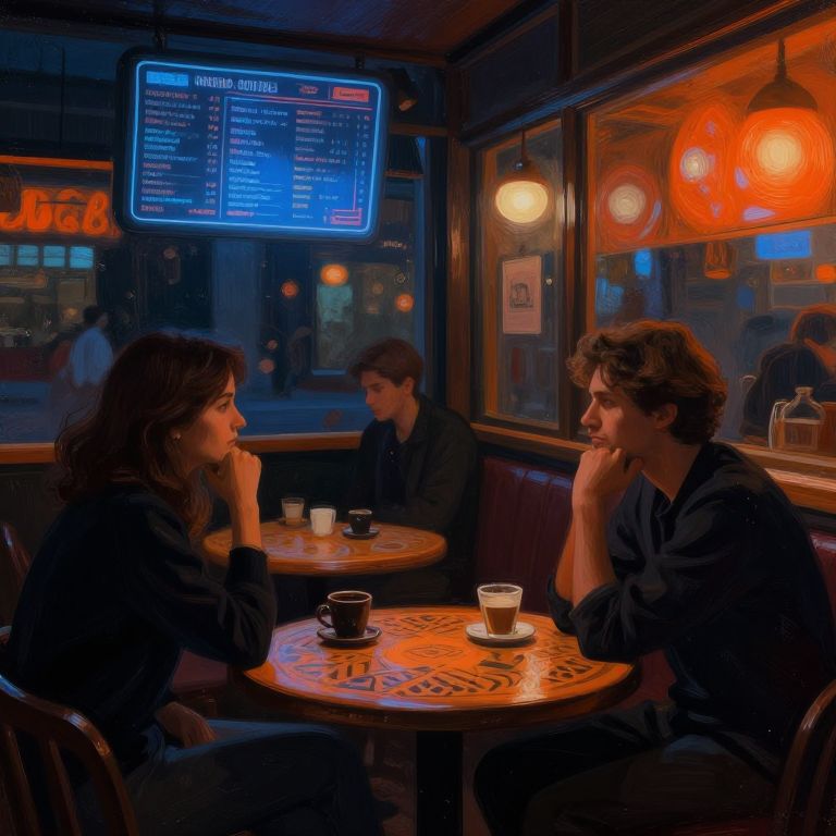 Night cafe AI art capturing an intimate moment inside a small, dimly lit cafe, AI brush strokes blending warm oranges and cool blues, holographic menu displays, intricate patterns on wooden tables, and figures lost in thought, merging digital art with classic night-time coffeehouse mood.