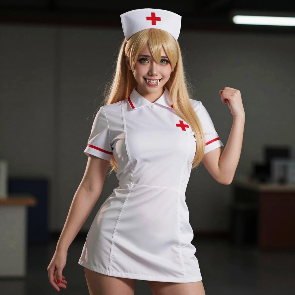 Photograph of a red-haired woman in a tight, white nurse uniform with red cross, low neckline, and short skirt, standing in a modern hospital