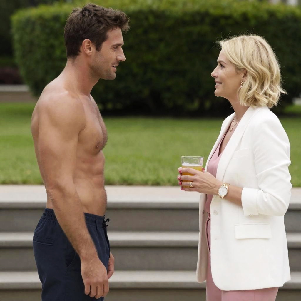 Photograph of a man in a gray suit seated at a green table, with a woman in a purple patterned dress standing behind him, smiling. Man looks up, smiling. Silver tray on table, ivy-covered house in background, yellow canopy, wicker chair. Woman's hands on man's chest. Both have light skin, brown hair.