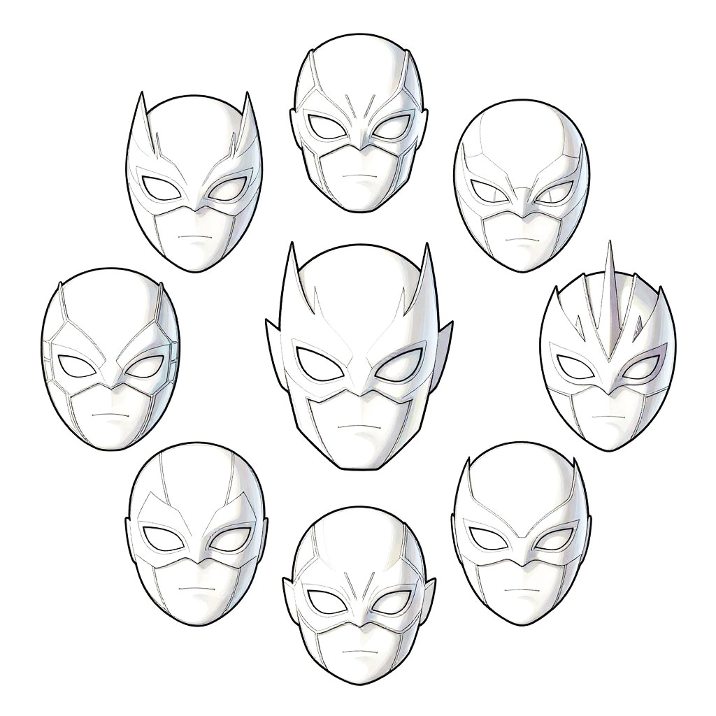 Marvel outline artwork of superhero masks arranged in a circle, sharp and angular line art, monochrome palette with subtle gradient highlights
