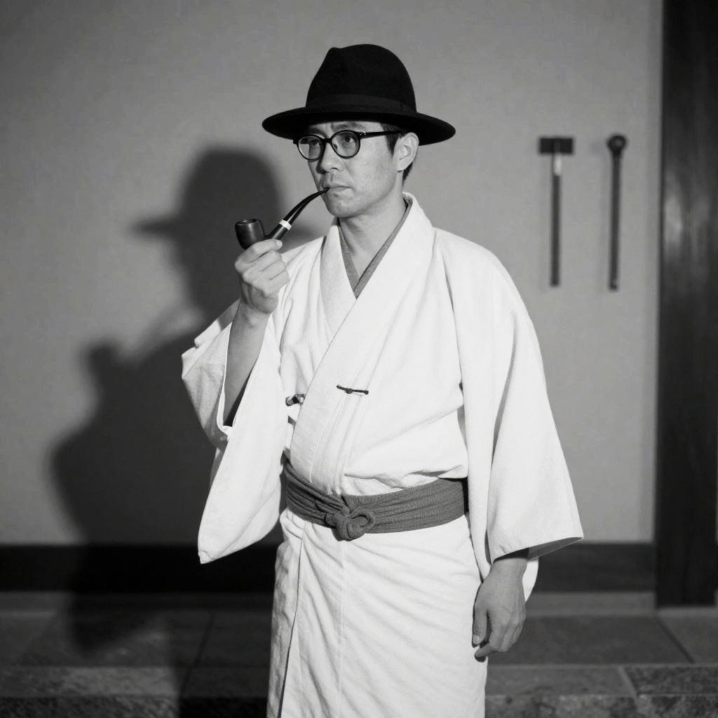 Black and white photograph of a man in a white kimono, black wide-brimmed hat, and glasses, holding a pipe. Shadow of his hat on the ured wall behind him. He has a neutral expression. Two tools on the wall to the right. Stone ground beneath him. Film noir style. Man stands slightly to the left, facing right.