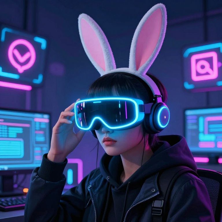 Photograph of an Asian woman in a dark hoodie, wearing a white bunny ear headband and neon blue virtual reality goggles. She adjusts her headphones, which are also illuminated in blue. The background features a dark room with neon pink and blue computer monitors displaying various data and icons. The scene has a futuristic, cyberpunk aesthetic with vibrant, glowing colors contrasting against her dark clothing. The woman's expression is focused, and her black hair is straight with bangs. The image combines elements of gaming culture and digital tech with a whimsical touch from the bunny ears.