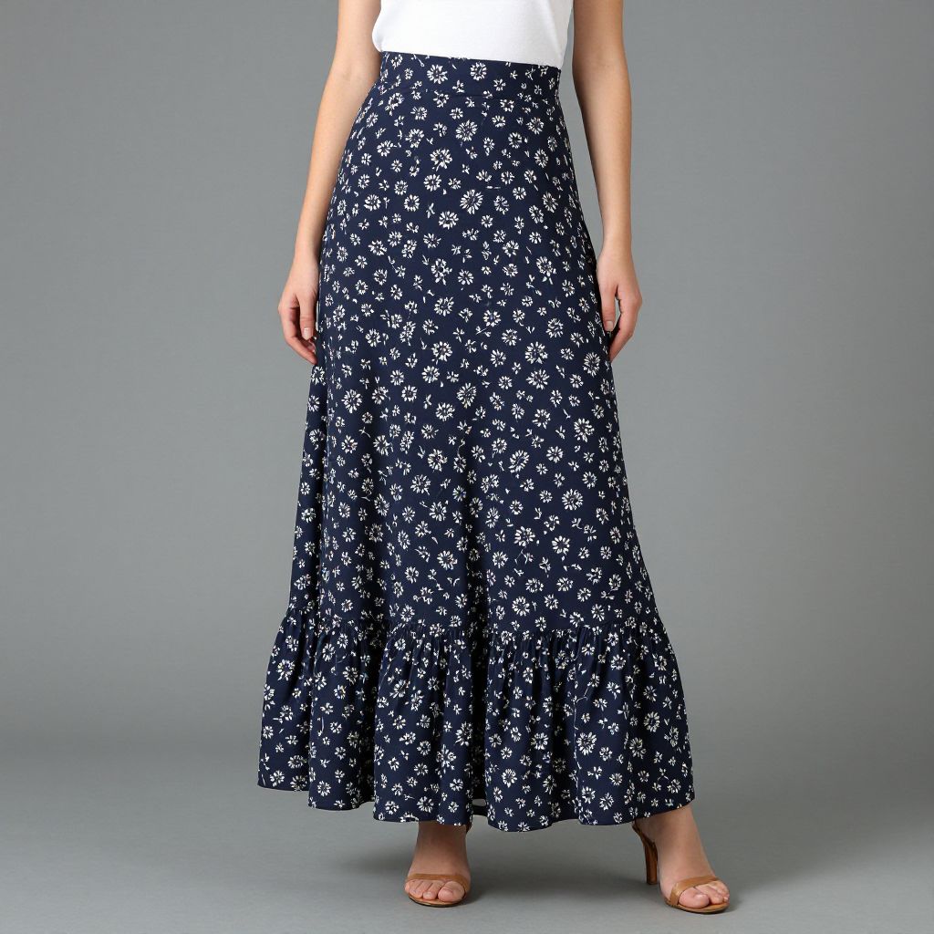 Photograph of a woman wearing a white top and a long, navy blue skirt with white floral patterns, standing against a gray background. She has beige