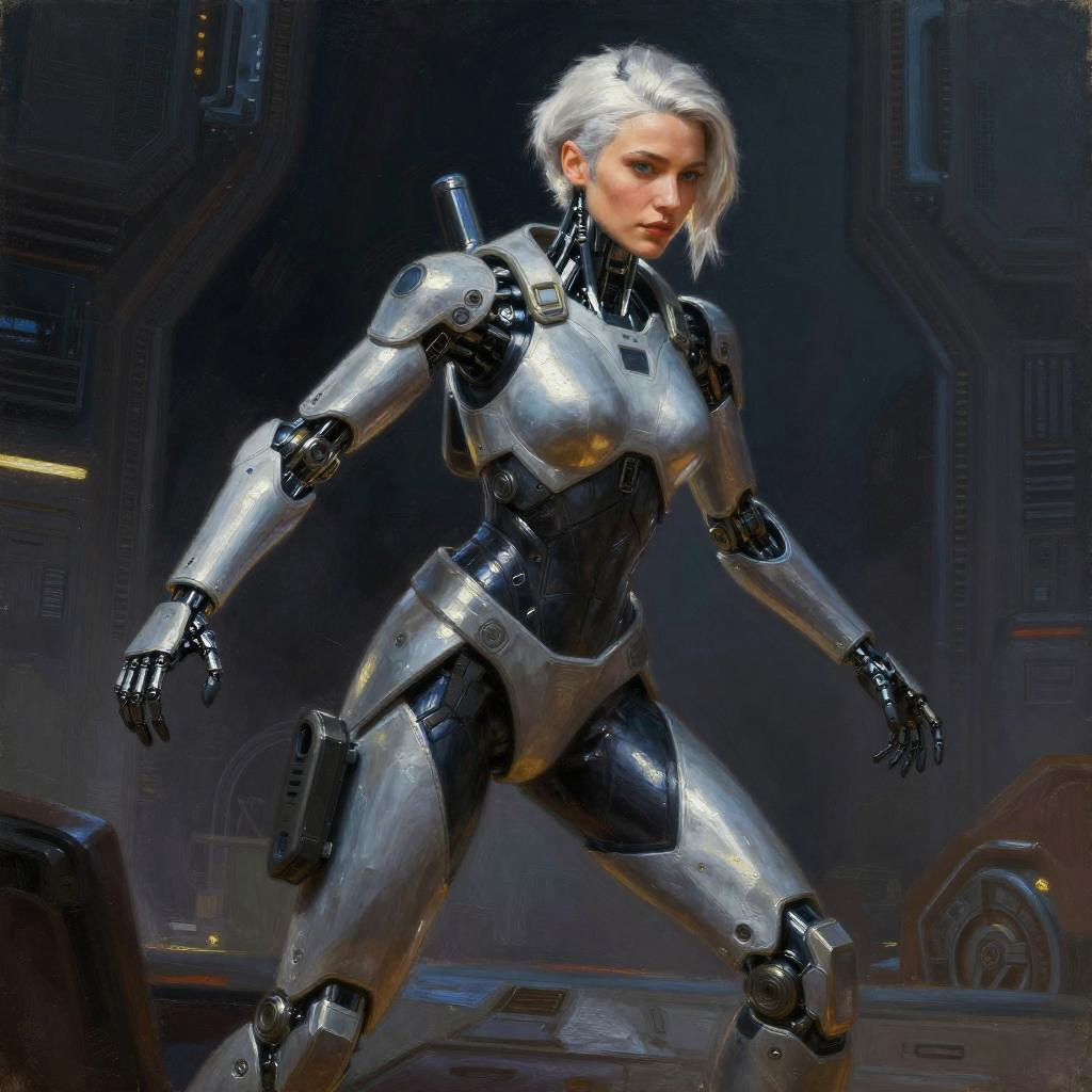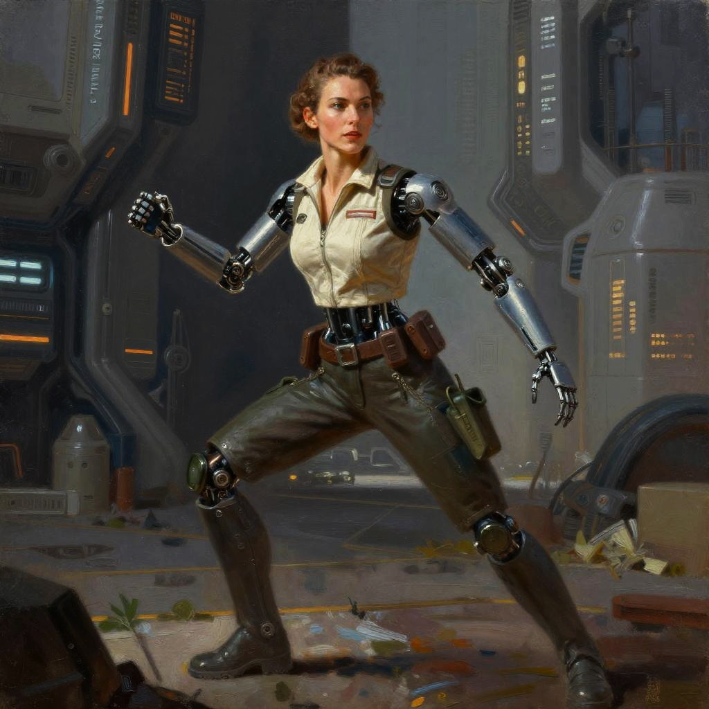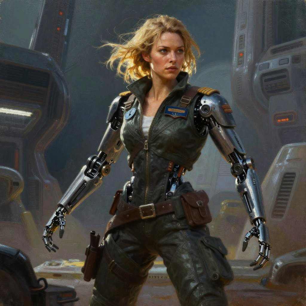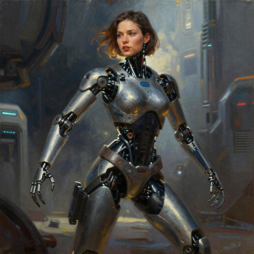 ((oil painting)) of attractive female modern Cyborg with cybernetic limbs, part cyborg, on patrol, cinematic, dynamic pose, fine details, reflections, 8k, ((dark shot)), soft volumetric lights, (backlit:1.3), (photorealistic:1.3), (Style-Glass), hdr, antialiased, ((syd mead)), sharp details, detailed background, ((masterpiece)), (painterly), (good anatomy), (good proportions), (good composition), (dramapaint), (analogue style), (empty hands), (futuristic scifi background)
