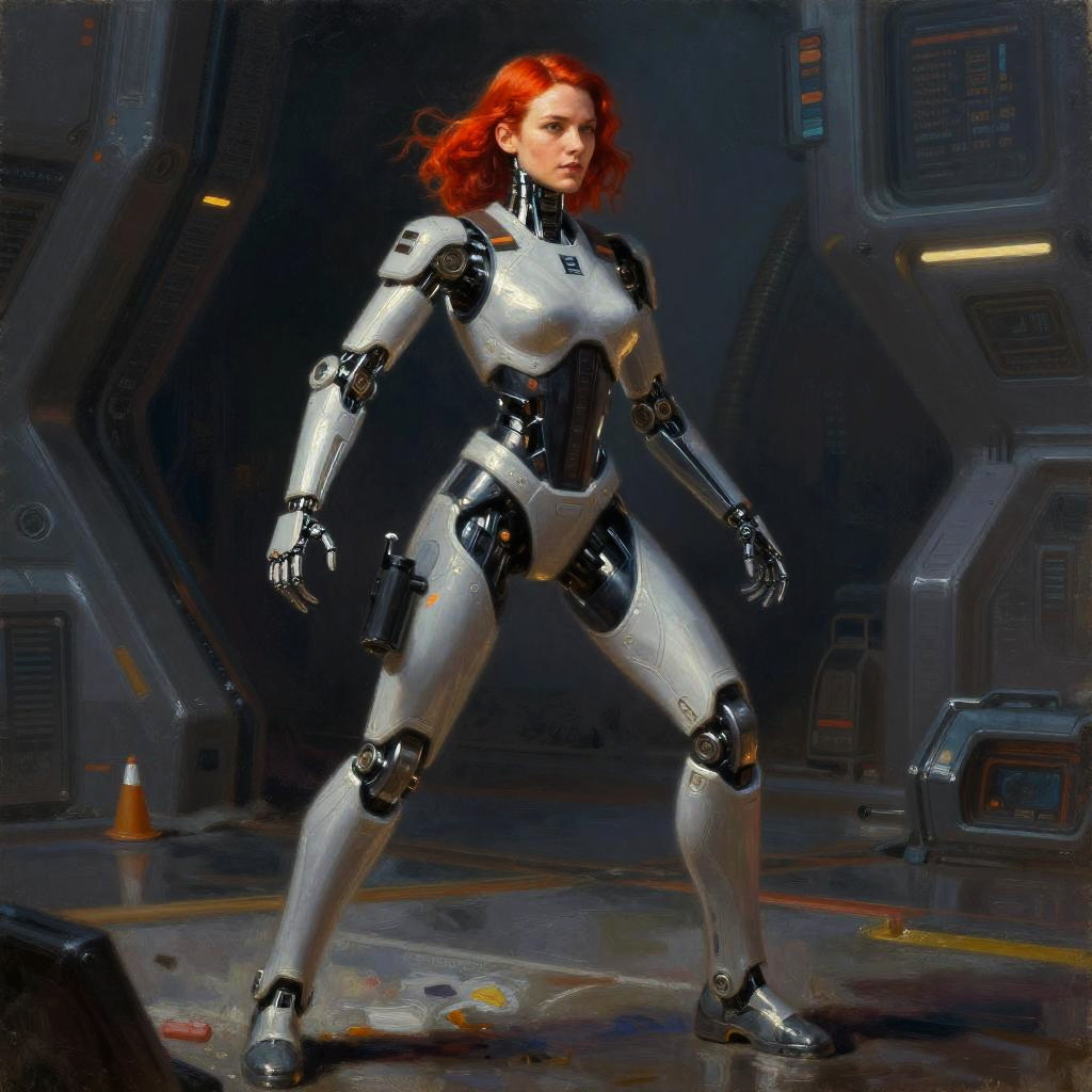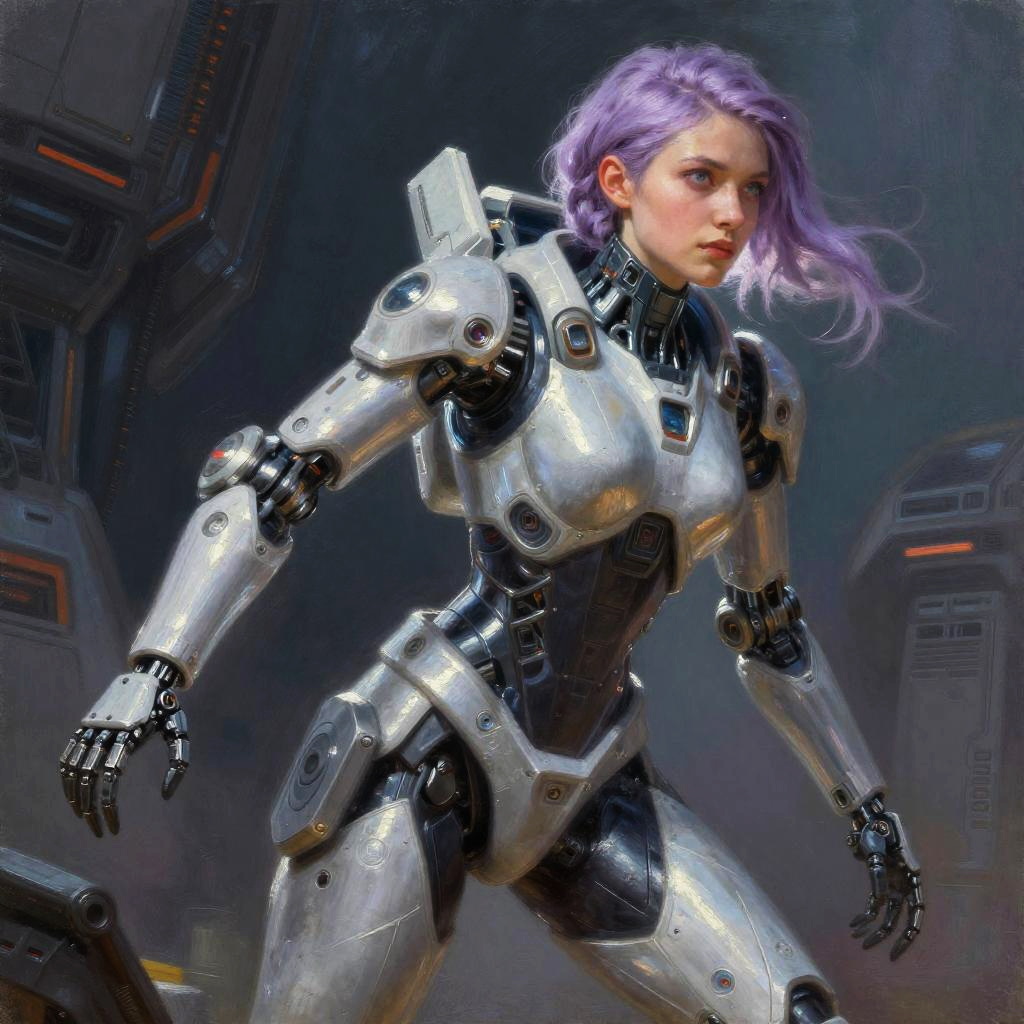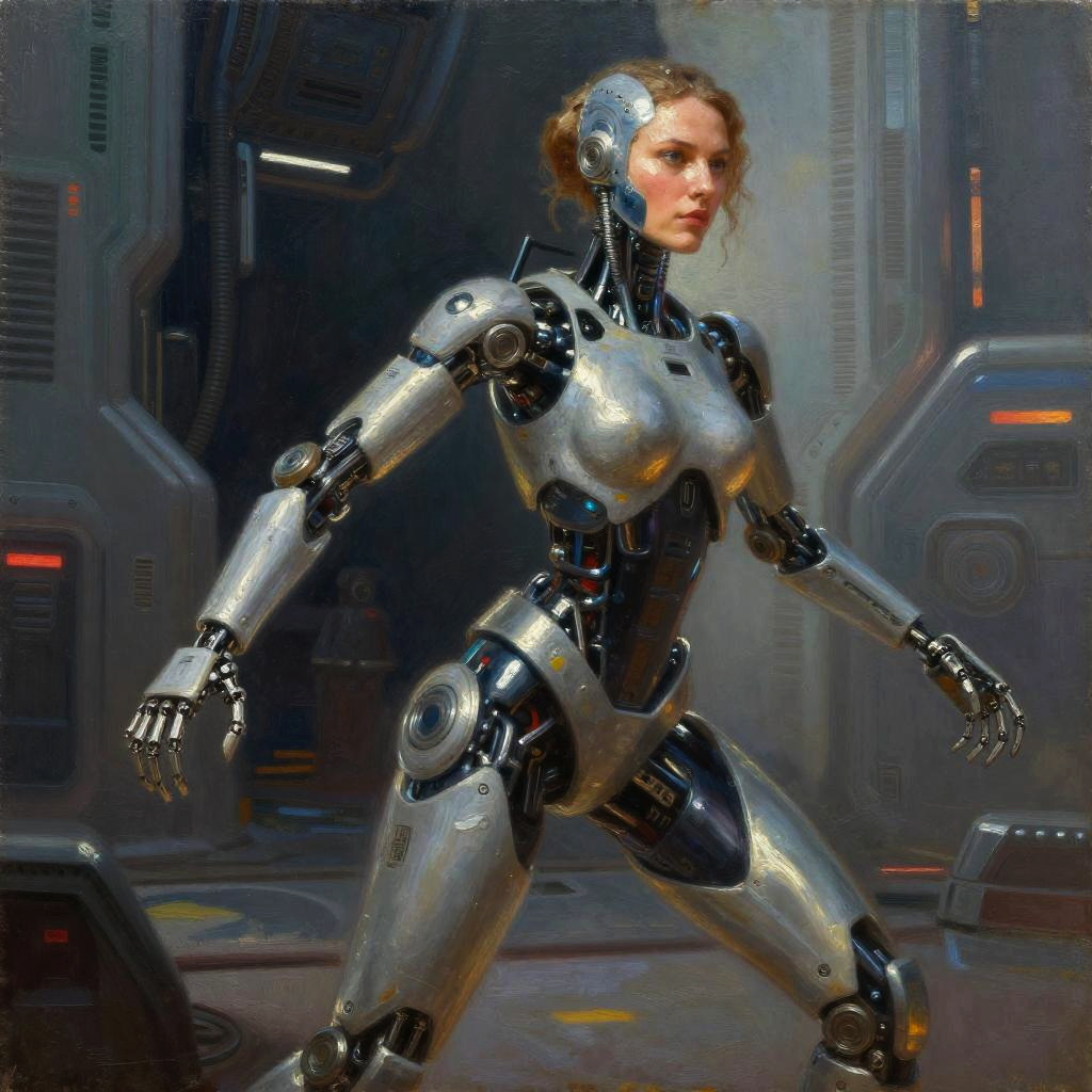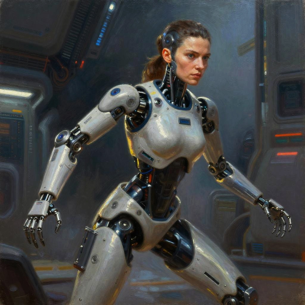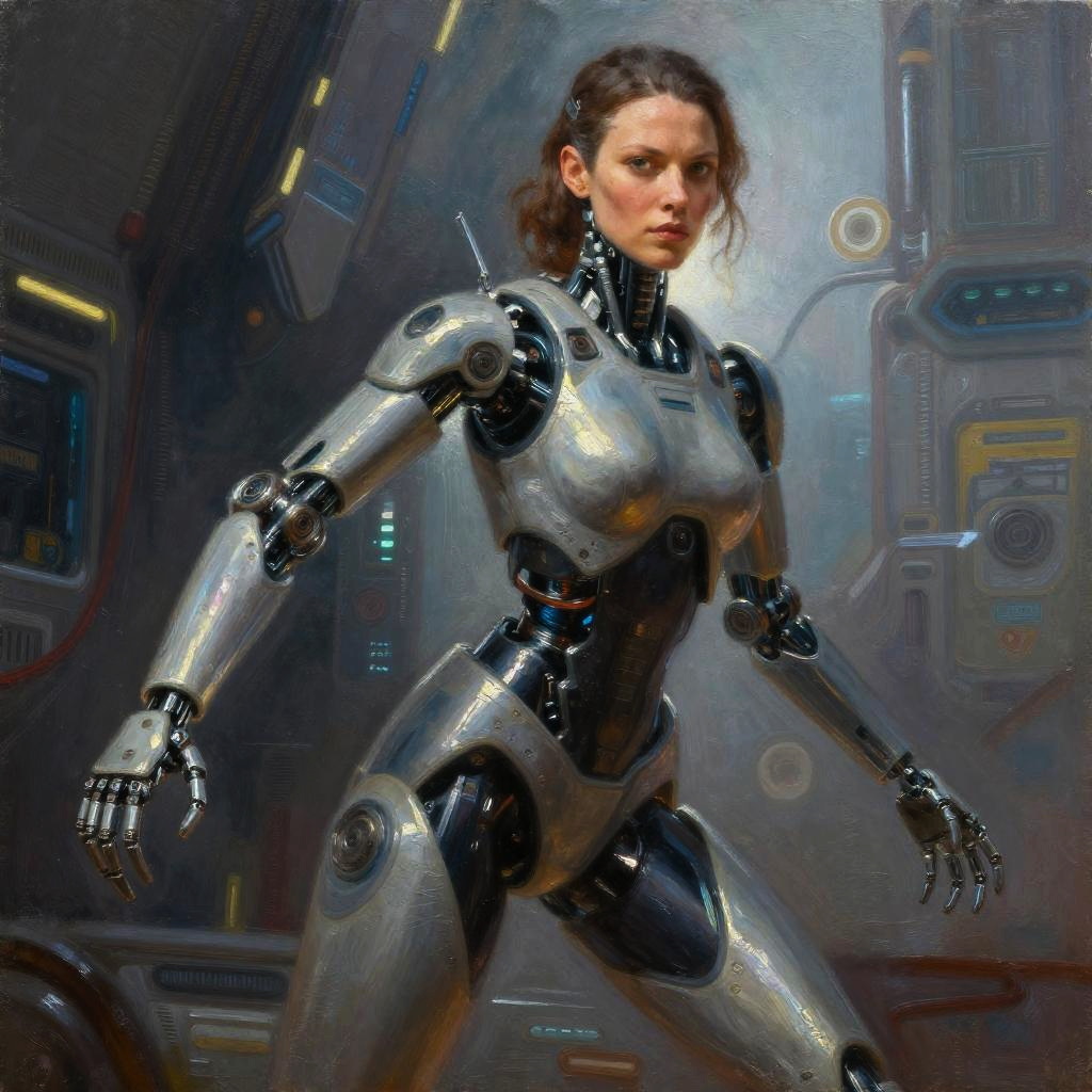 ((oil painting)) of attractive female modern Cyborg with cybernetic limbs, part cyborg, on patrol, cinematic, dynamic pose, fine details, reflections, 8k, ((dark shot)), soft volumetric lights, (backlit:1.3), (photorealistic:1.3), (Style-Glass), hdr, antialiased, ((syd mead)), sharp details, detailed background, ((masterpiece)), (painterly), (good anatomy), (good proportions), (good composition), (dramapaint), (analogue style), (empty hands), (futuristic scifi background)