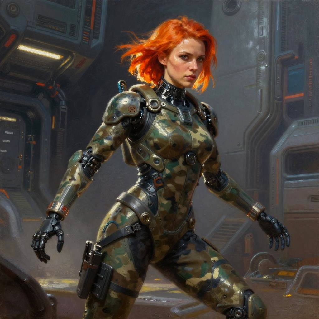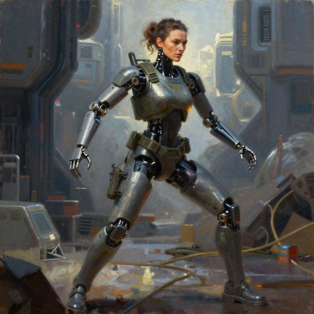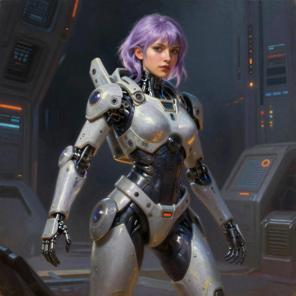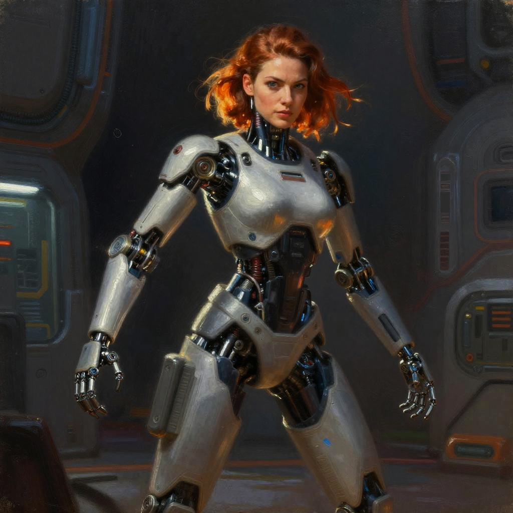 ((oil painting)) of attractive female modern Cyborg with cybernetic limbs, part cyborg, on patrol, cinematic, dynamic pose, fine details, reflections, 8k, ((dark shot)), soft volumetric lights, (backlit:1.3), (photorealistic:1.3), (Style-Glass), hdr, antialiased, ((syd mead)), sharp details, detailed background, ((masterpiece)), (painterly), (good anatomy), (good proportions), (good composition), (dramapaint), (analogue style), (empty hands), (futuristic scifi background)