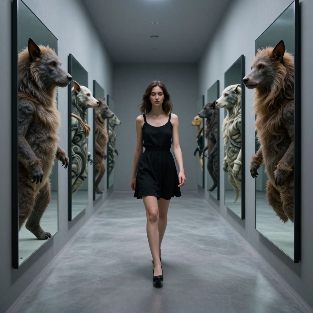 A surreal digital artwork depicts a woman walking down a sterile, mirrored hallway where autonomous mirrors transform her reflection into fantastical beasts, symbolizing hidden facets of her identity through dramatic lighting and high-definition rendering.