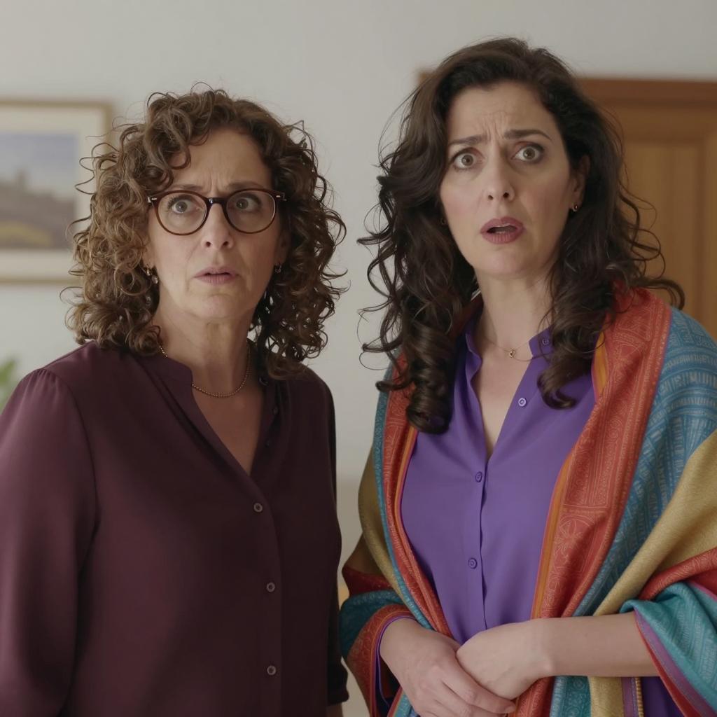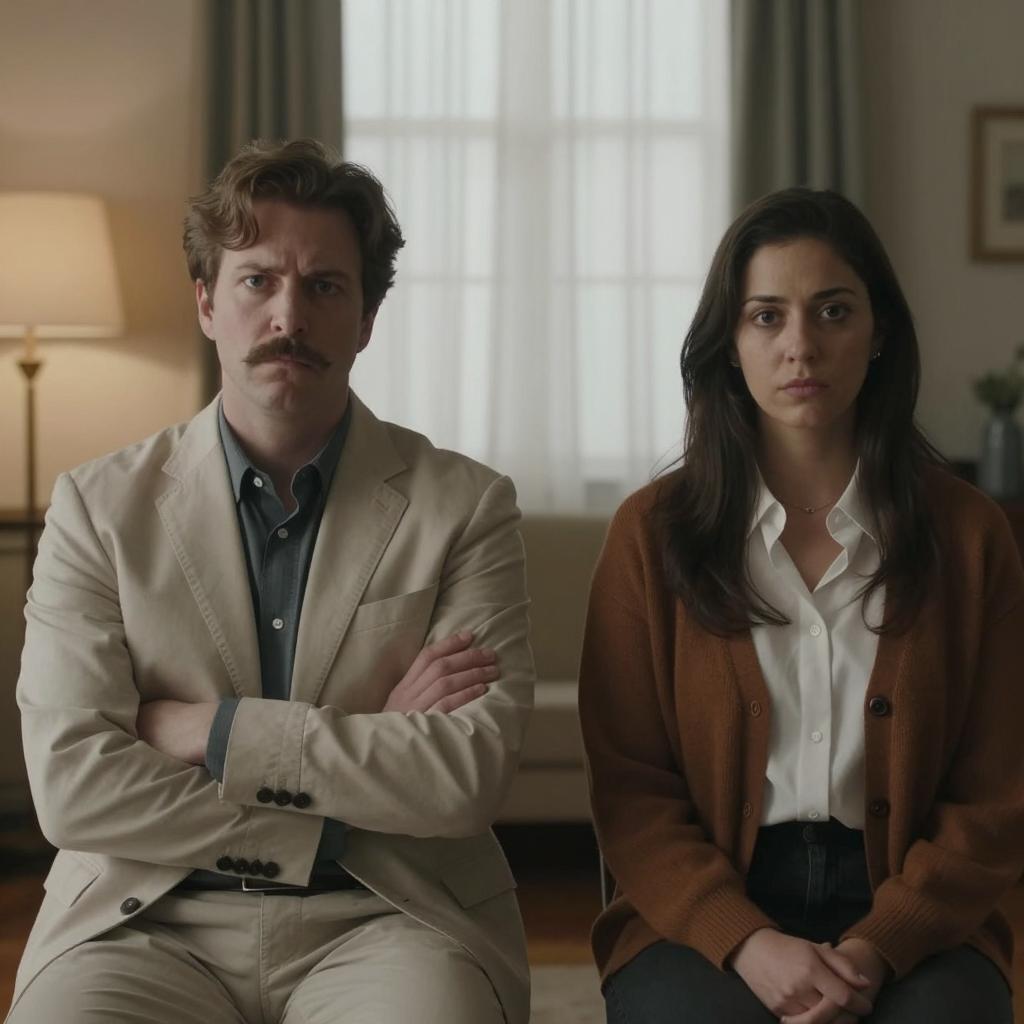 Man with curly dark hair and glasses, wearing a white shirt and gray pants, stands behind a woman with shoulder-length brown hair, wearing a red polka dot sleeveless top. She looks to the side, slightly tense. Background: silver beaded curtain with colorful abstract patterns. Man's hands on woman's waist. Both standing.