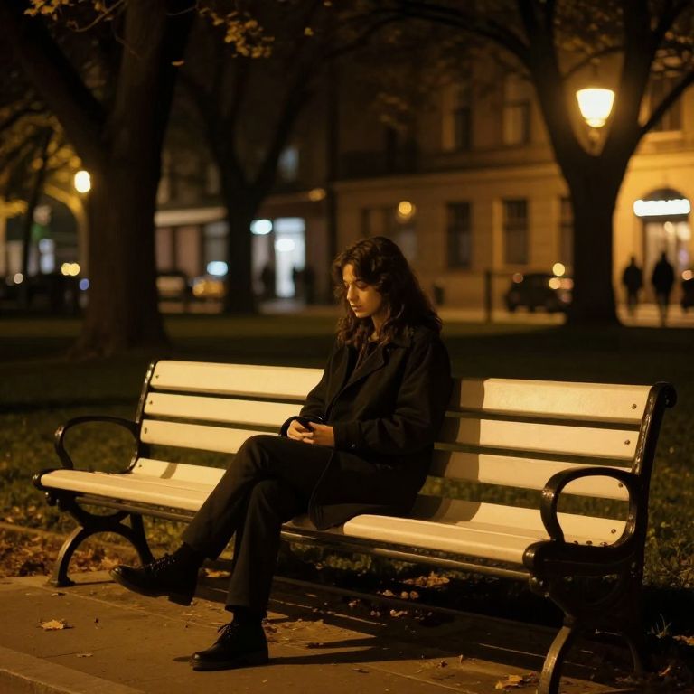 Photograph of a woman with long, dark hair, wearing a black coat and black pants, sitting alone on a white wooden bench with black metal armrests in a dimly lit, urban park at night. She holds a smartphone in both hands, looking down at it. The background is blurry, featuring tall, dark trees and warmly lit street lamps, with a few illuminated buildings and indistinct figures in the distance. Fallen leaves are scattered on the ground near the bench. The overall mood is contemplative and serene.