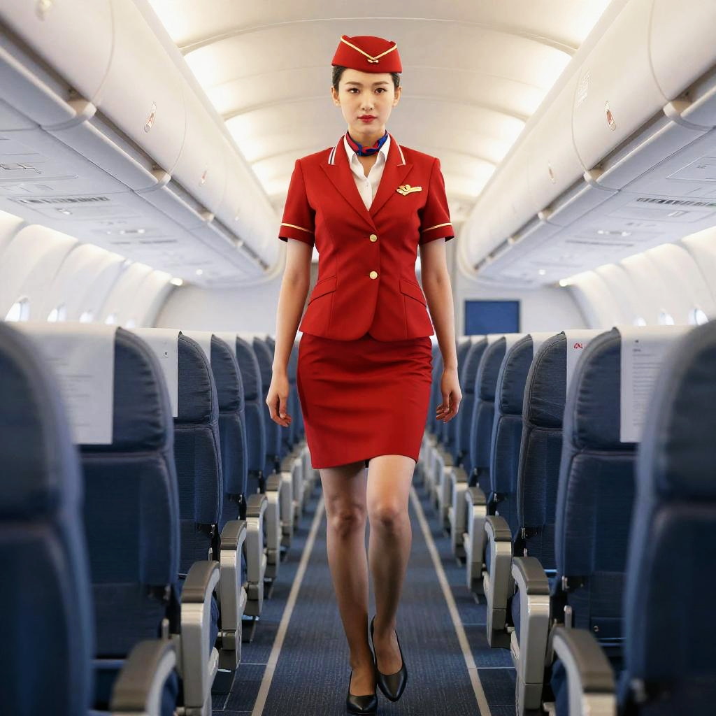 A female flight attendant dressed in a red uniform with a matching hat and a colorful neck scarf walking down the aisle of an airplane. She carries a black handbag and wears black high heels. The airplane cabin features rows of blue seats and overhead compartments.