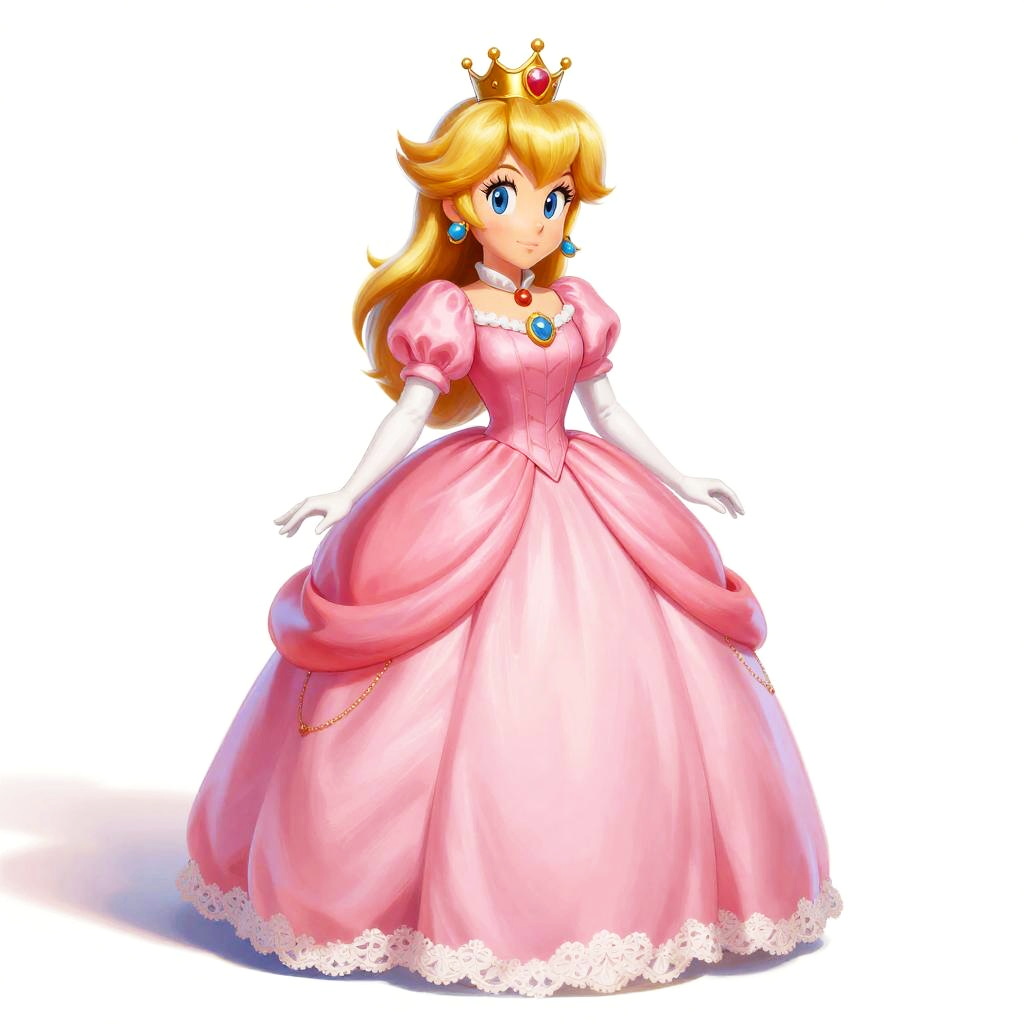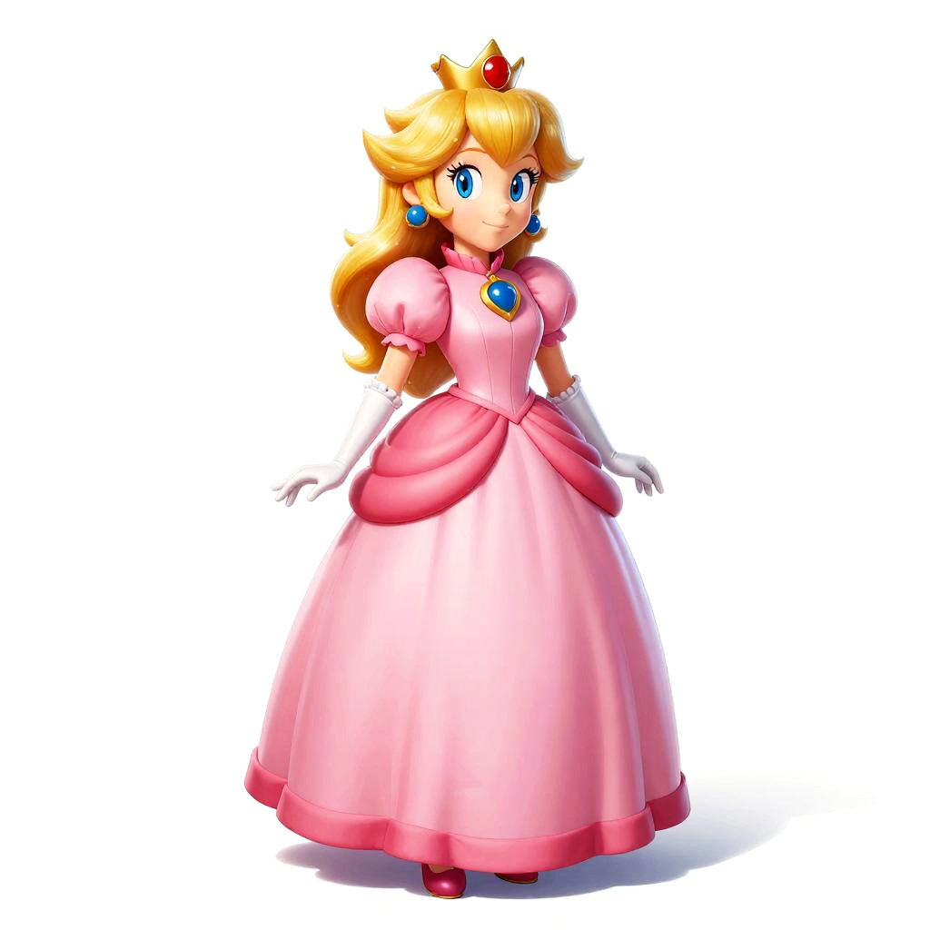 Princess Peach standing gracefully on a pristine white background, wearing her iconic pink dress with intricate golden embroidery, soft lighting highlighting her gentle smile and flowing blonde hair, fantasy art style, highly detailed.
