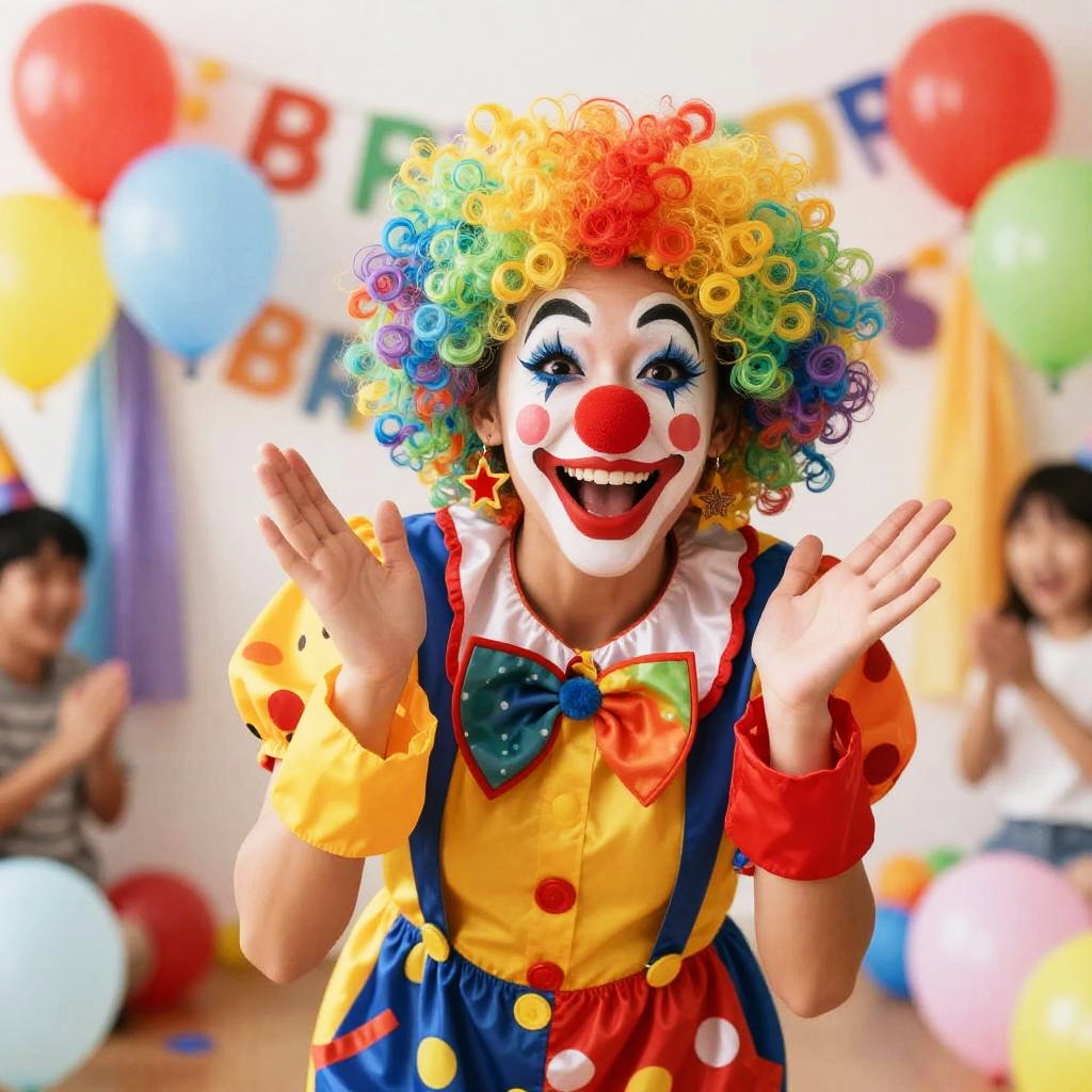 A female clown brings laughter and entertainment to the celebration. (Best quality: 1.3) The setting is adorned with colorful decorations, balloons, and a backdrop of excitement. (Masterpiece: 1.3) Meticulous attention is given to the clown's costume, which features a vibrant and playful ensemble, complete with a rainbow-colored wig, a polka-dot jumpsuit, and oversized shoes. (8K: 1.2) The high-resolution imagery captures the vividness of the colors and the intricate details of the costume, showcasing the meticulous craftsmanship. (Close-up shot style: 1.4) The camera zooms in, highlighting the clown's expressive face, adorned with exaggerated makeup, including a bright red nose, rosy cheeks, and a wide, painted smile. (Realistic art style: 1.3) The artwork captures the clown's infectious energy and enthusiasm as she engages with the children, her eyes twinkling with mischief and her gestures animated with joy. With a playful and gentle demeanor, she captivates the young audience, eliciting laughter and wonder with her comedic antics, magic tricks, and balloon twisting skills. The image encapsulates the spirit of joy and entertainment, as the female clown creates cherished memories and brings happiness to the birthday celebration. (Full body: 1.2)