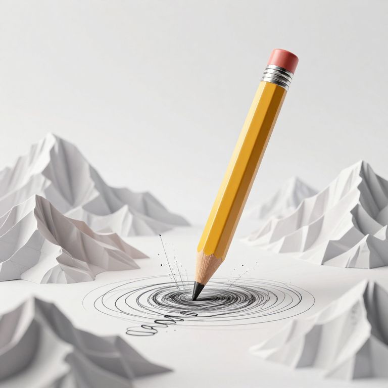 In a surreal 3D-rendered scene, a sentient pencil stands upright amidst intricately layered, paper-thin mountains, its tip poised as if ready to reshape the ever-evolving landscape through imaginative scribbles and dynamic visual effects.