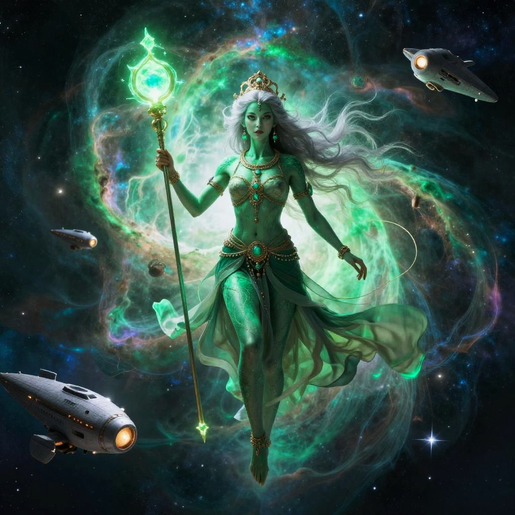 Mystical green Orion girl with emerald skin and silver hair, floating in space near a radiant green nebula, traditional alien jewelry and flowing robes, holding a glowing staff, starships in the background, vibrant cosmic colors and ethereal atmosphere.