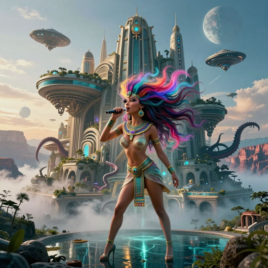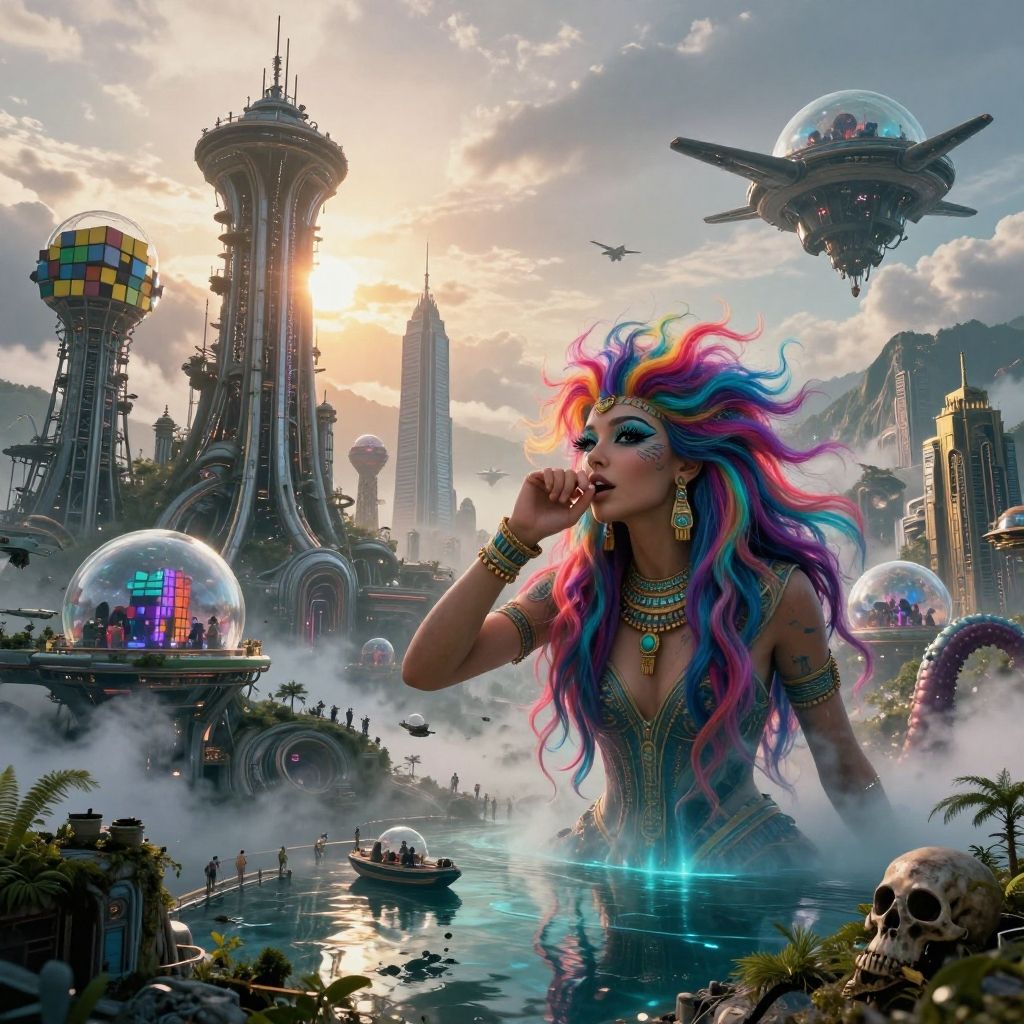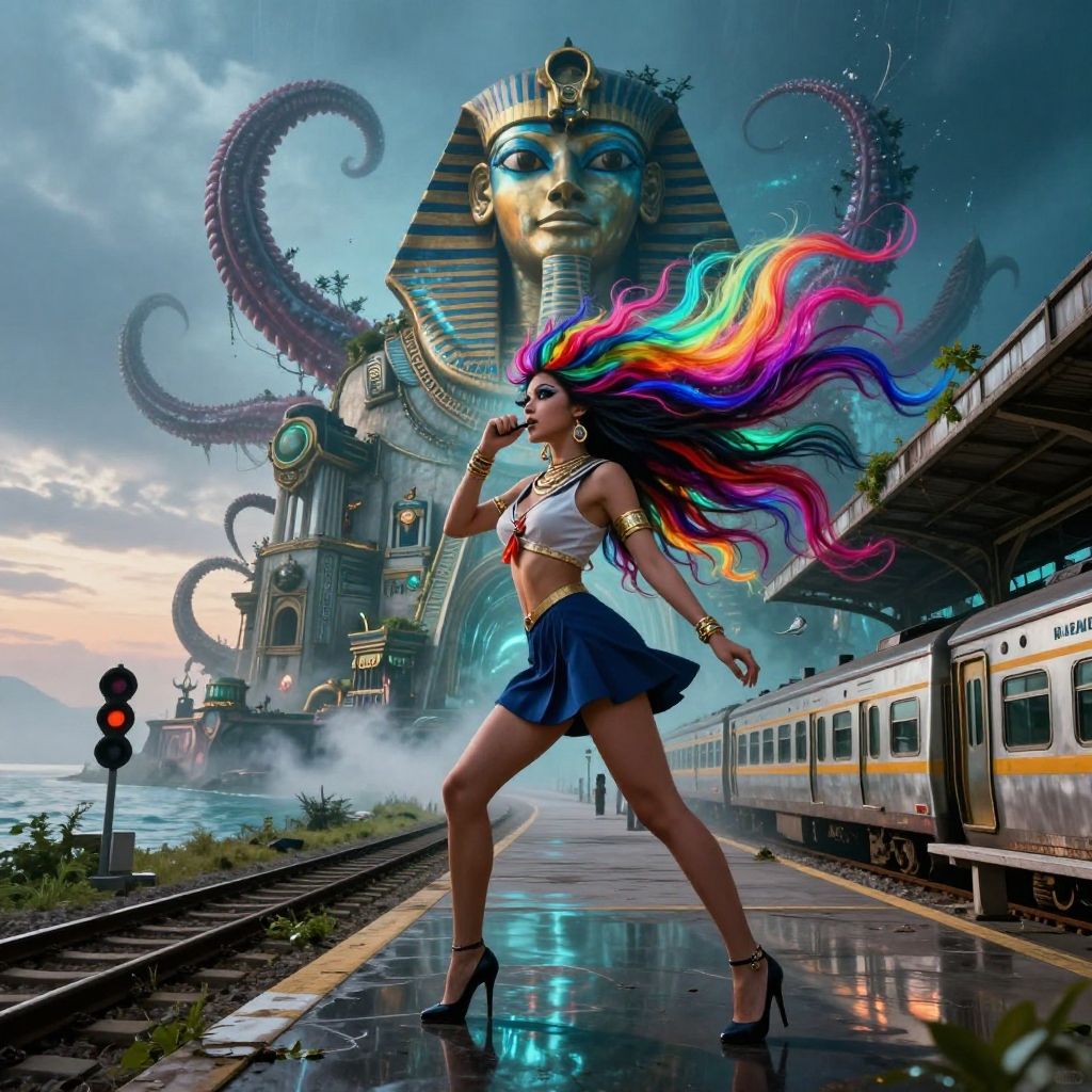 (otherworldly, otherworldly atmosphere, otherworldly appearance), highly insanely detailed, masterpiece, top quality, best quality, highres, 4k, 8k, RAW photo, ((ancient egyptian theme:1.2)), Hong Kong structure, building, structure, taiwan, korean, swirling energy, tentacle, (underwater), reflection, reflective floor, abandoned building, overgrown with vegetation, [volumetric fog], cinematic lighting, colorful, colourful, (long_hair, long hair, random colors hair, glowing hair, hair over one eye, long messy hair), (eyelashes, eyeliner, eyeshadow, eyelashes, long eyelashes), collar, earrings, jewelry, necklace, armlet, high-heels, nsfw, cleavage, perfect female body, makeup, action pose, drunk, biting, dawn, old book style ink illustration, on parchment, ink splashes, ink stains, ink smears, faded ink, (female enforcer:1.2), (futuristic:1.5), bus station, glass, fog, moon, in the clouds, skyscrapers, futuristic transport, fractals, night, gloomy tones, mentixis, linquivera, (fantasy world)
