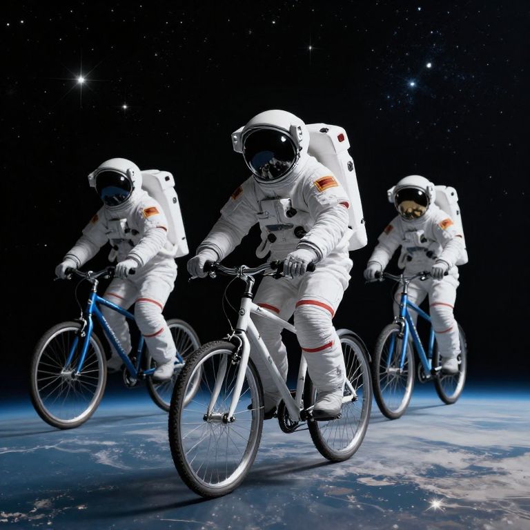 Photorealistic CGI of three astronauts in white space suits riding bicycles in space, with Earth's surface and stars in the background.