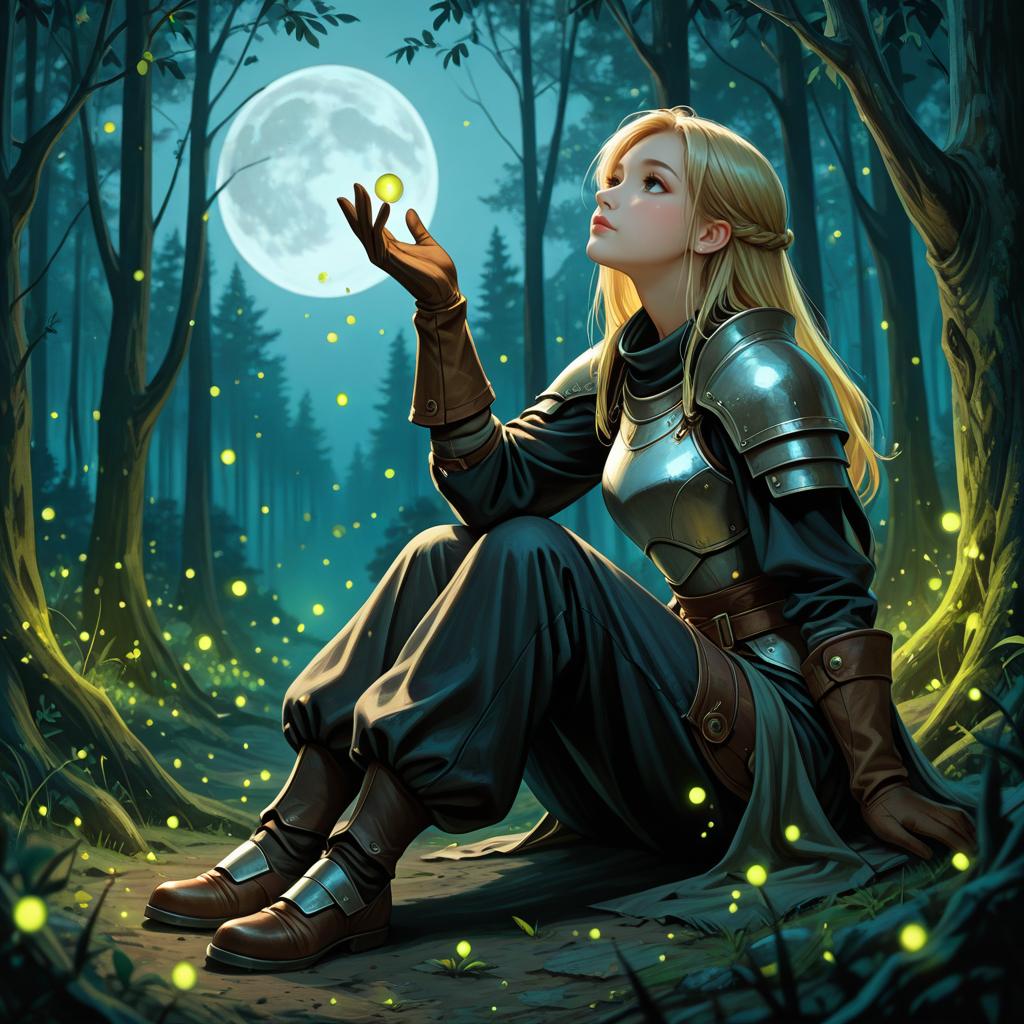 Digital artwork of a blonde, armored woman sitting in a moonlit forest, holding a glowing firefly, surrounded by ethereal yellow lights.
