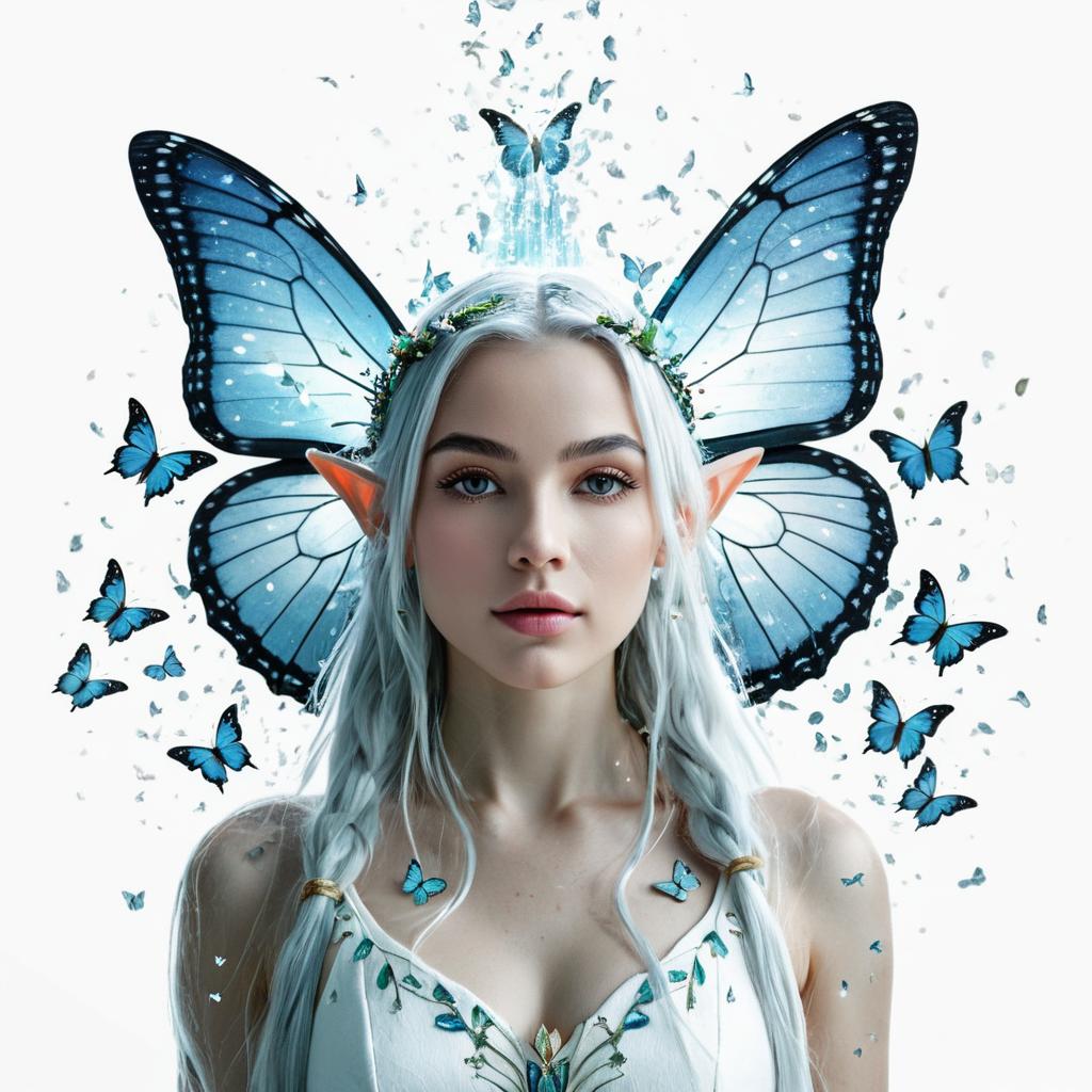 Digital artwork of a white-haired, blue-eyed elf with pointed ears, adorned with a blue gem headpiece, surrounded by vibrant blue and green butterflies.